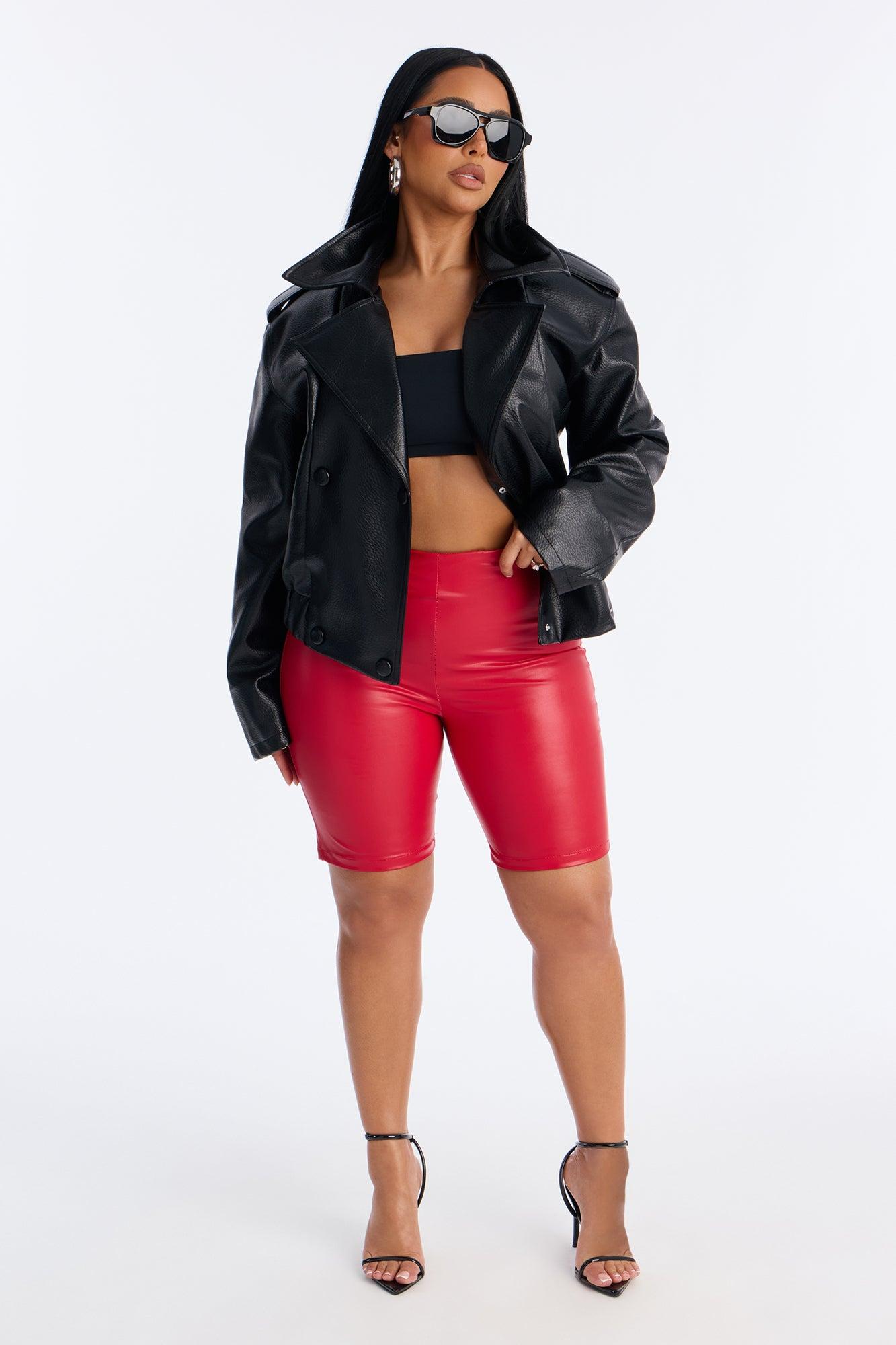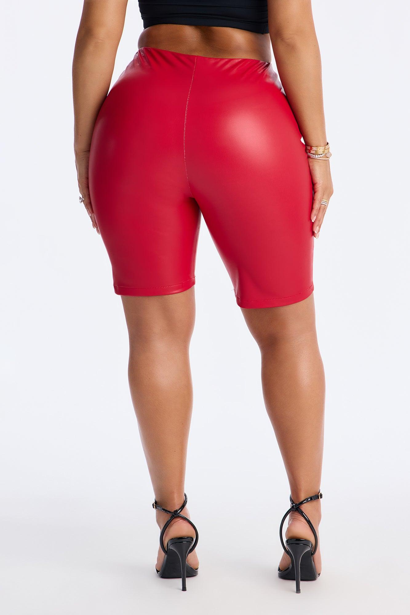 Available In Black, Chocolate And Red. Biker Short Elastic Waistband High Rise Pull On Faux Leather Stretch 100% Polyester with Polyurethane coating Imported