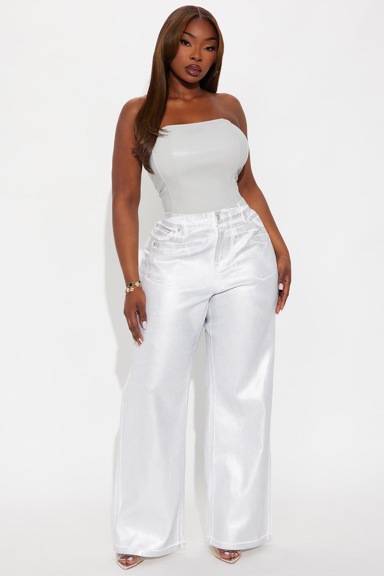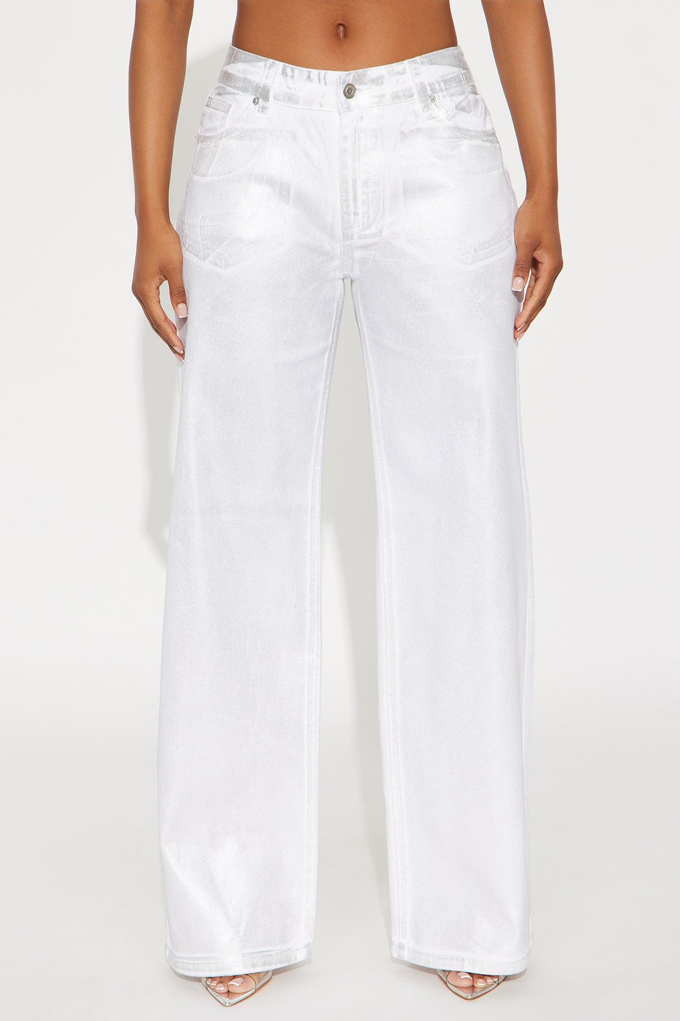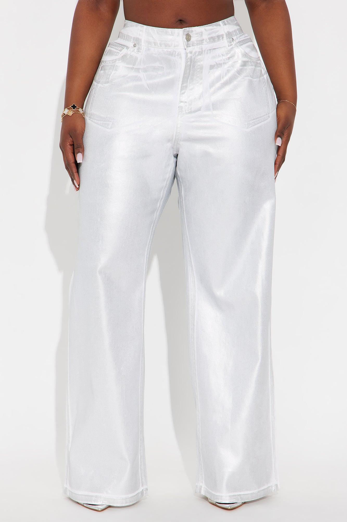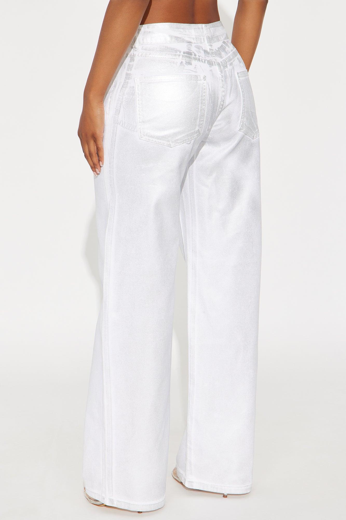 Available In White/Silver. Twill Rigid Wide Leg Metallic Pant Non Stretch Regular 33" Inseam Low Rise Button And Zipper Closure Belt Loops Hand And Back Pockets Disclaimer: Due To The Specialized Distressing & Wash Process, Each Garment Is Unique. Self: 100% Cotton Imported California Proposition 65WARNING: Cancer and Reproductive Harm - www.P65Warnings.ca.gov.