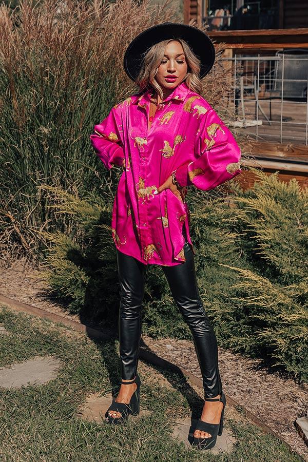 - Wow the crowd with this luxe button up! - Unlined material with a leopard pattern and a satin finish - A collared v-cut neckline - A button-up front - Long loose sleeves with button closure cuffs - A relaxed silhouette that ends in a rounded hemline Measurements S : Bust 46", Hip 48", Length 29", Sleeve Length 20", Waist 47". M : Bust 48", Hip 50", Length 29", Sleeve Length 20.5", Waist 49". L : Bust 50", Hip 52", Length 29.5", Sleeve Length 21", Waist 51".