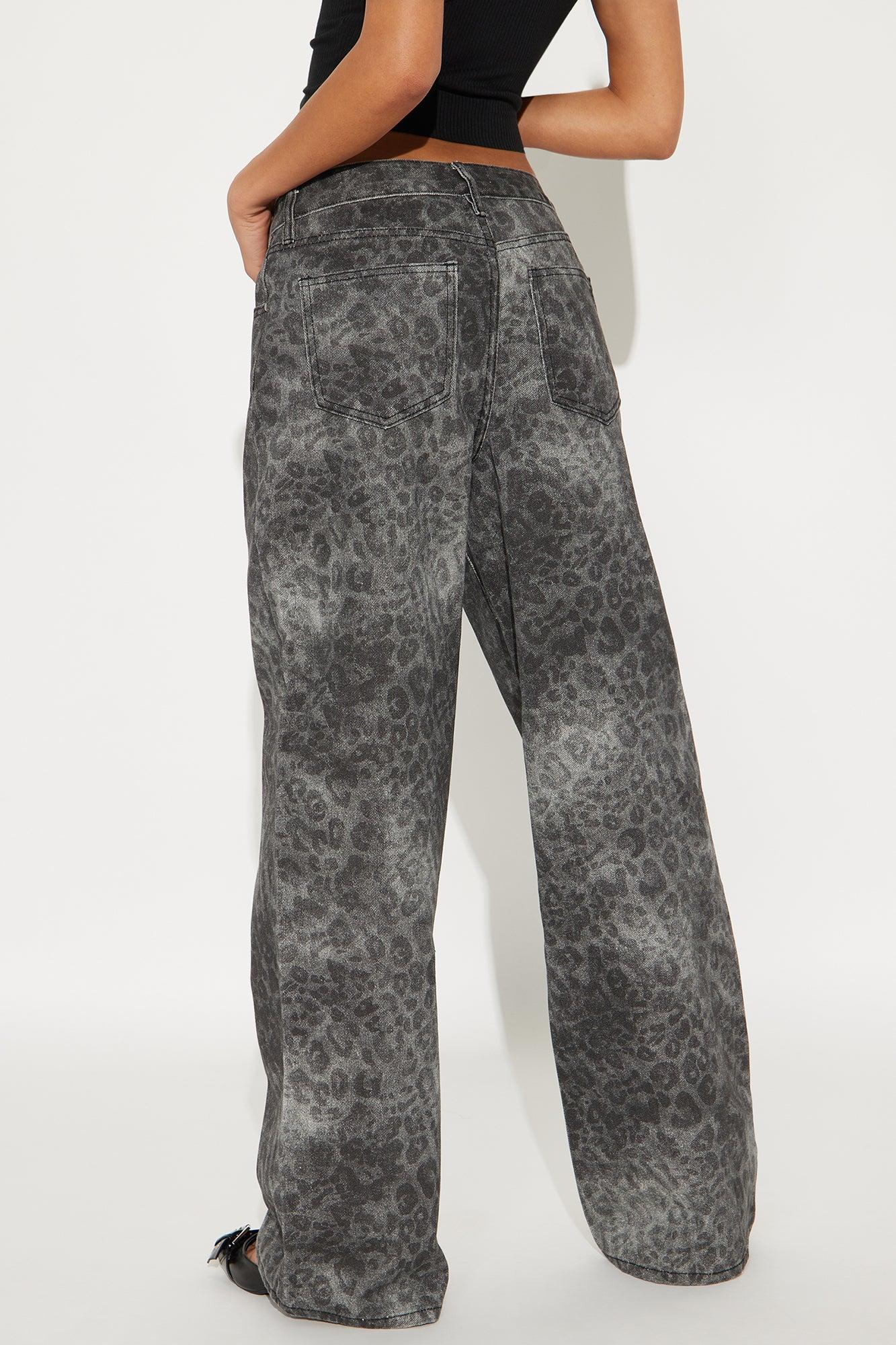 Available In Dark Grey. 5 Pocket Leopard Print Wide Leg Jean Non Stretch 10.5" Rise 33" Inseam Disclaimer: Due To The Specialized Wash And Print Process, Each Garment Is Unique. 100% Cotton Imported California Proposition 65 WARNING: Cancer and Reproductive Harm - www.P65Warnings.ca.gov.