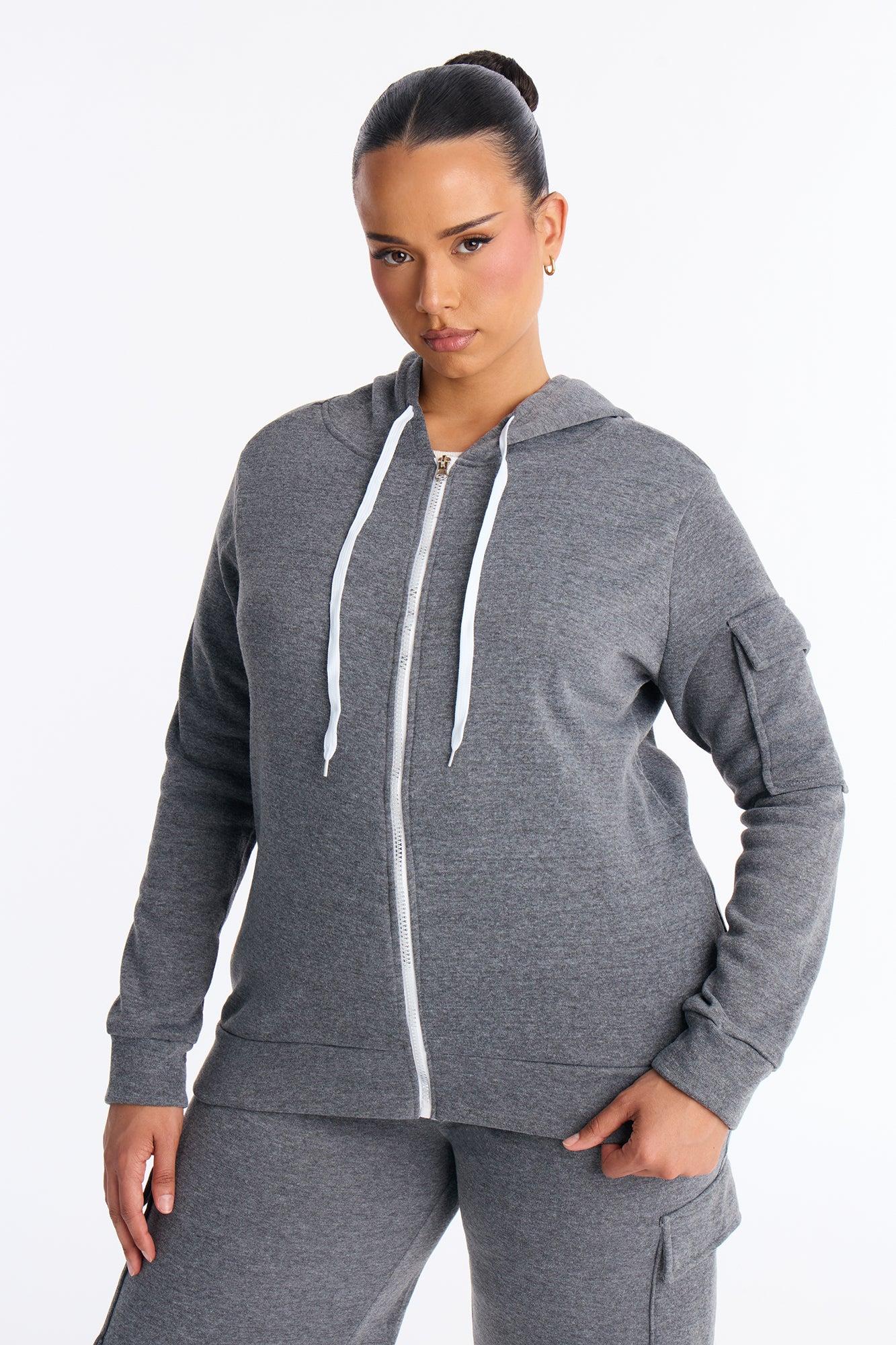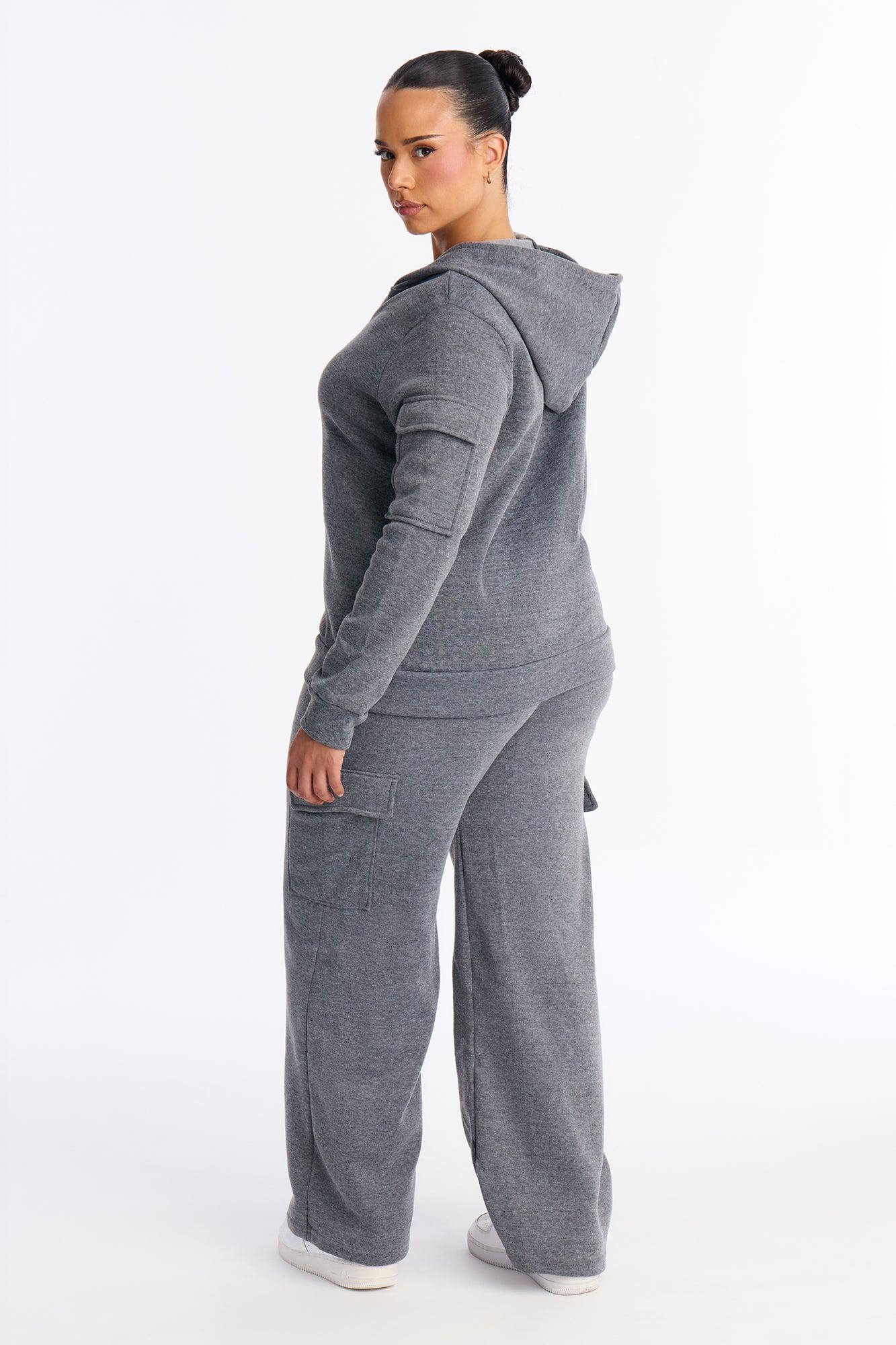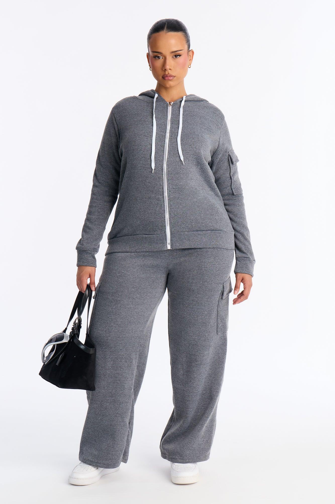 Available In Black, Grey, Olive And Taupe. 2 Piece Ensemble Sweatshirt Zip Up And Pant Set Stretch Hoodie Elastic Waistband Cargo And Utility Wide Leg 29" Inseam 100% Polyester Imported California Proposition 65WARNING: Cancer and Reproductive Harm - www.P65Warnings.ca.gov.