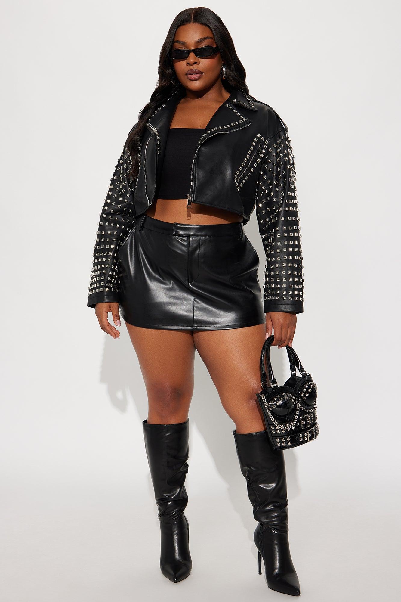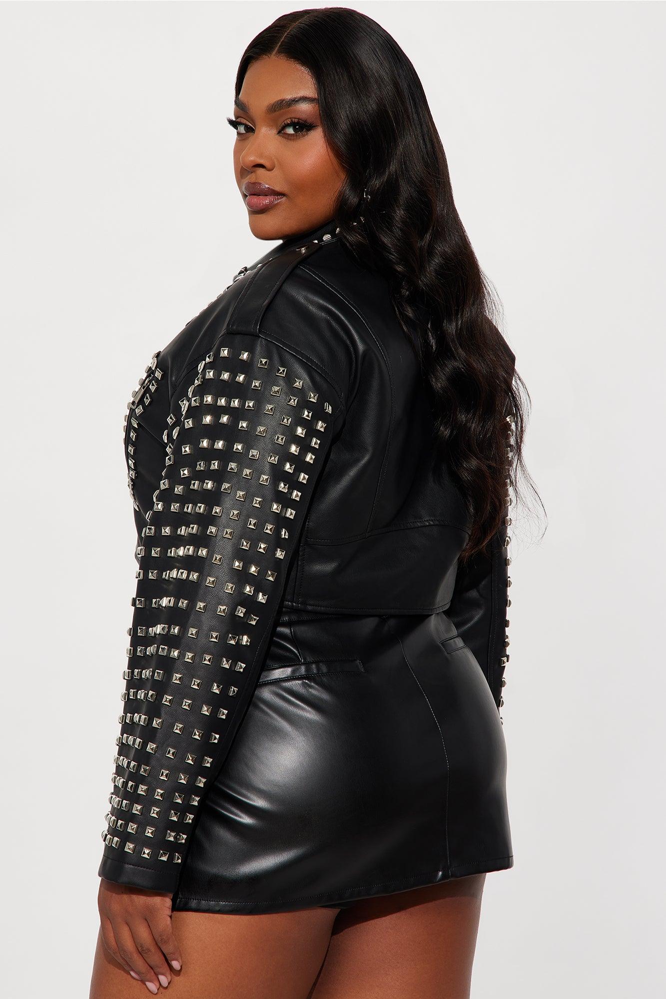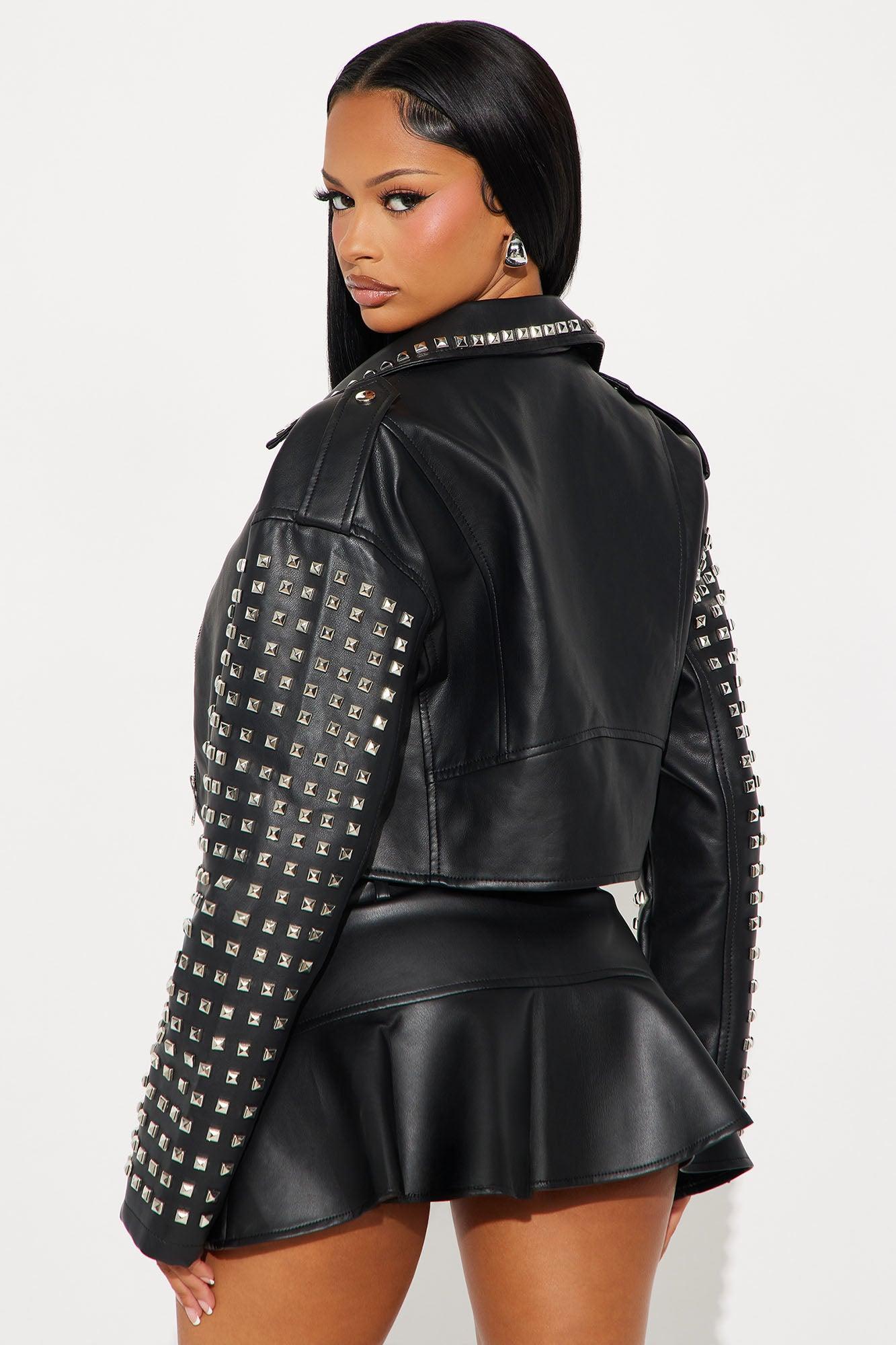 Available In Black And Olive. Faux Leather Moto Jacket Collar Neckline Long Sleeves Zipper Closure Zipper pockets Studded Fully Lined Cropped Shell: Coating 100% Polyurethane Ground: 90% Polyester 10% Viscose Lining: 100% Polyester Imported