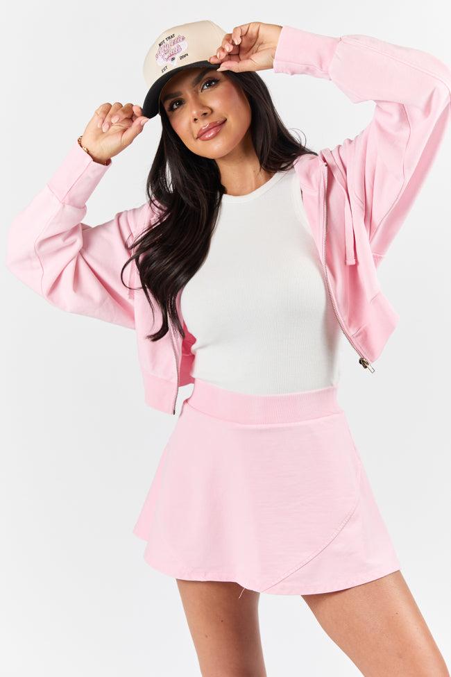 Details Fleece Skort Pink Fabric has stretch Elastic waistband Lined with shorts Size small inseam: 2" Material and Care 92% cotton 8% spandex, Contrast: 95% cotton 5% spandex Hand wash cold, tumble dry low Patterns may vary Materials may have natural variations Colors may vary from different viewing devices.