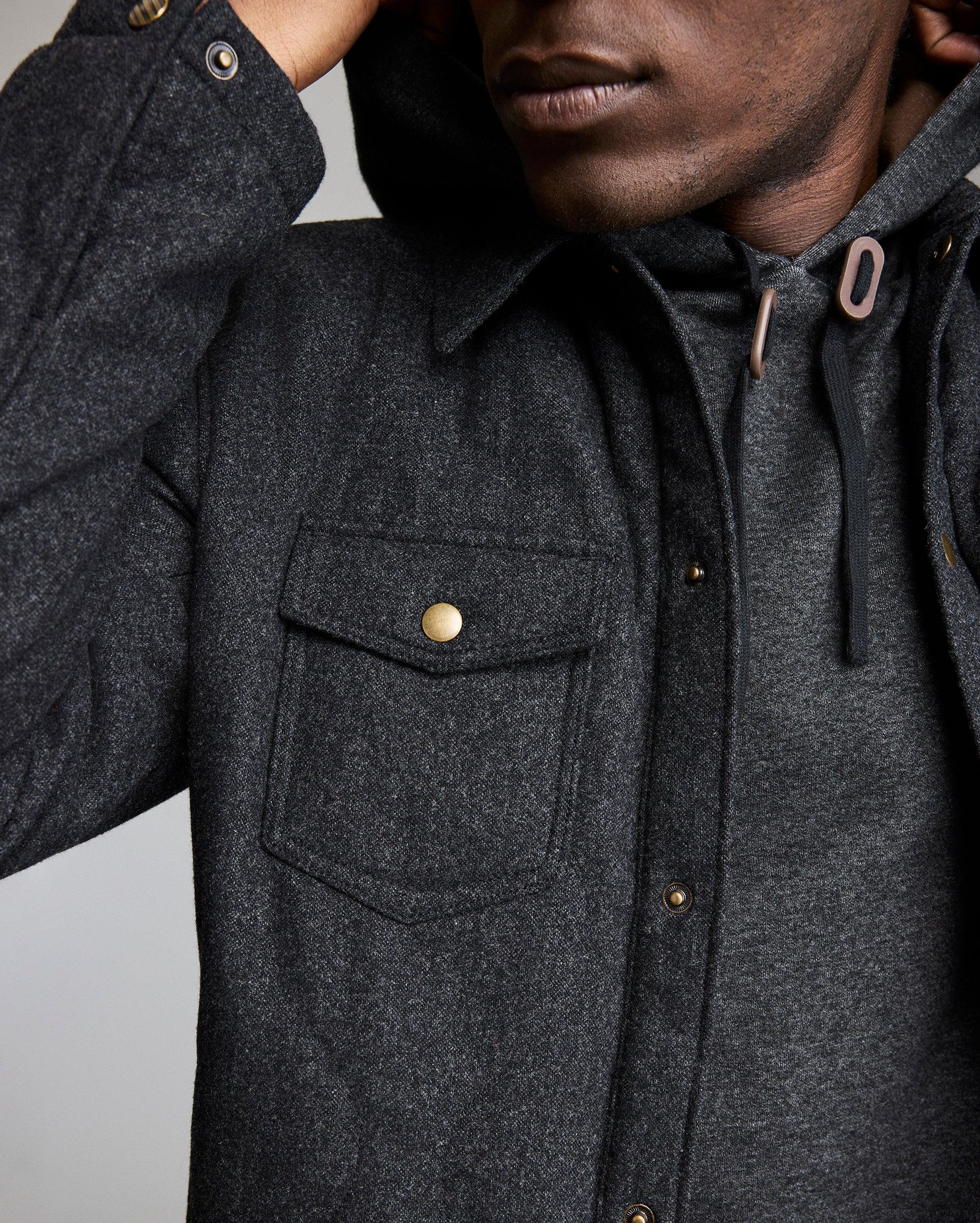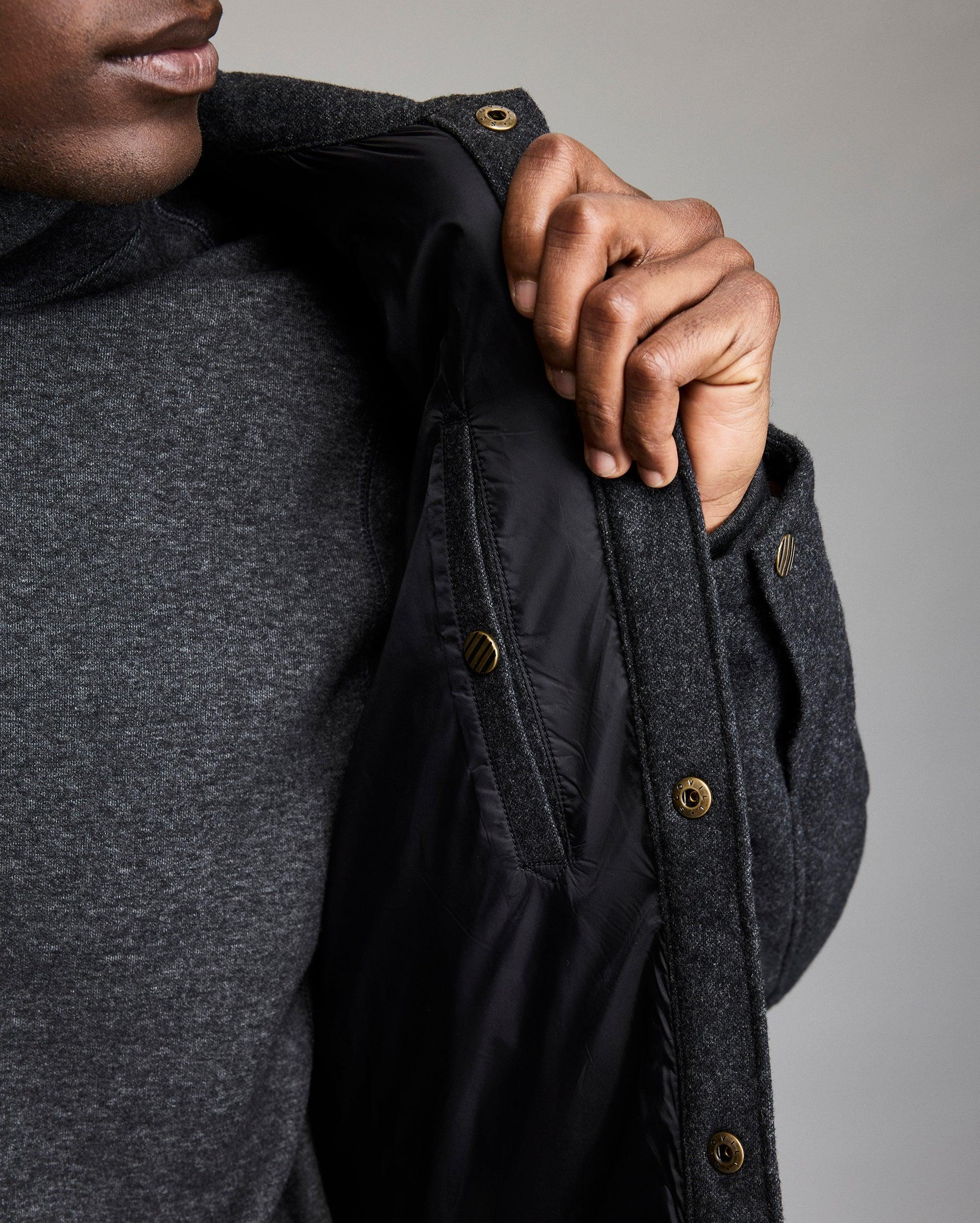 The Theo shirt jacket offers comfort and versatility in equal measure, thanks to its onion quilted body that has been insulated with comfortemp air fill, made with recycled polyester. Finished with heritage Billy Reid details like antique brass snaps at the chest and cuffs, a leather locker loop, and a subtle ribbon st