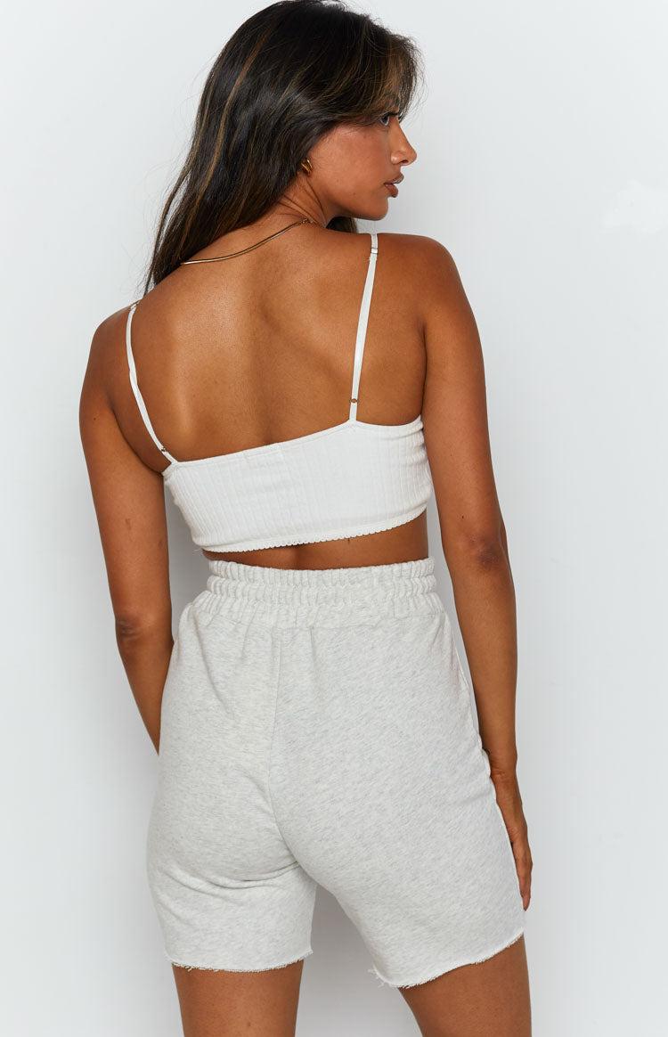 Grey Track PantsYou will get so much wear out of these high-waisted track shorts! Literally just chuck on with any crop for a casual yet cool lookhigh waisted with drawstring waistRaw hemPink heart print on front left legThin/mid-weight soft material with stretch