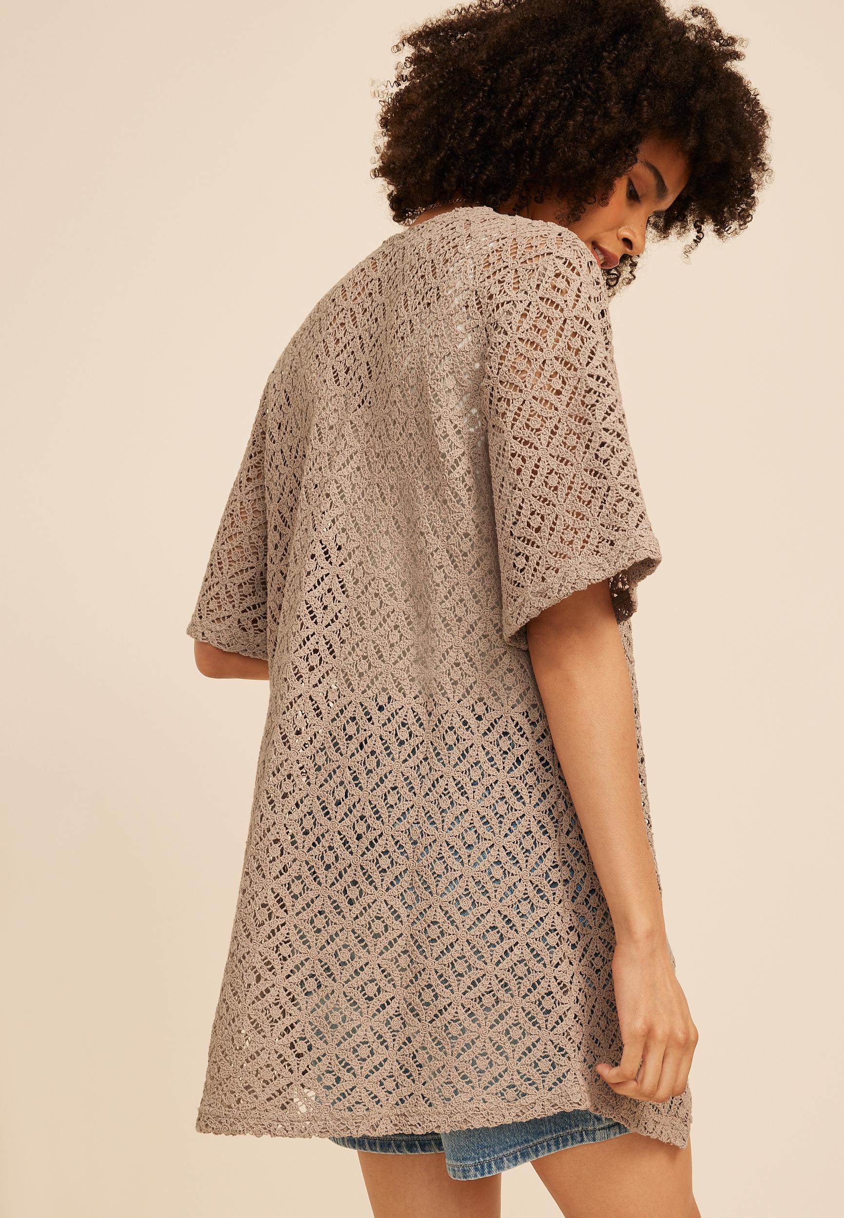 Lightweight and easy to layer, this airy crochet kimono brings effortless texture to everyday looks. The breathable cotton open stitch design drapes softly for a relaxed feel that elevates tanks tees and denim shorts alike. Style it over a simple cami and cutoffs for warm days or layer it atop a fitted dress for an easy polished finish. .mar-pdp-section .mar-product-description {color: #000;}.mar-pdp-section .mar-product-description ul, .mar-pdp-section .mar-product-description ul>li {margin-left: 10px;padding-left: 10px;}.mar-pdp-section .mar-product-description .mar-product-description-content ul li{list-style-type: disc;margin: 0 0 5px;padding-left: 5px;}.mar-pdp-section .mar-product-description p {color: #000;padding: 5px 0;}@media only screen and (max-width: 1023px){.mar-pdp-section .mar-product-description .mar-product-description-content ul li{list-style-type: disc !important;} .mar-pdp-section .mar-product-description .mar-product-description-content .mar-tab-content ul{padding-left: 10px;}.mar-pdp-section .mar-product-description .mar-product-description-content .mar-tab-content {font-weight: 300;}} Features: breathable cotton fabric allover crochet detailingy elbow length sleeves relaxed drape for easy layering open front design
