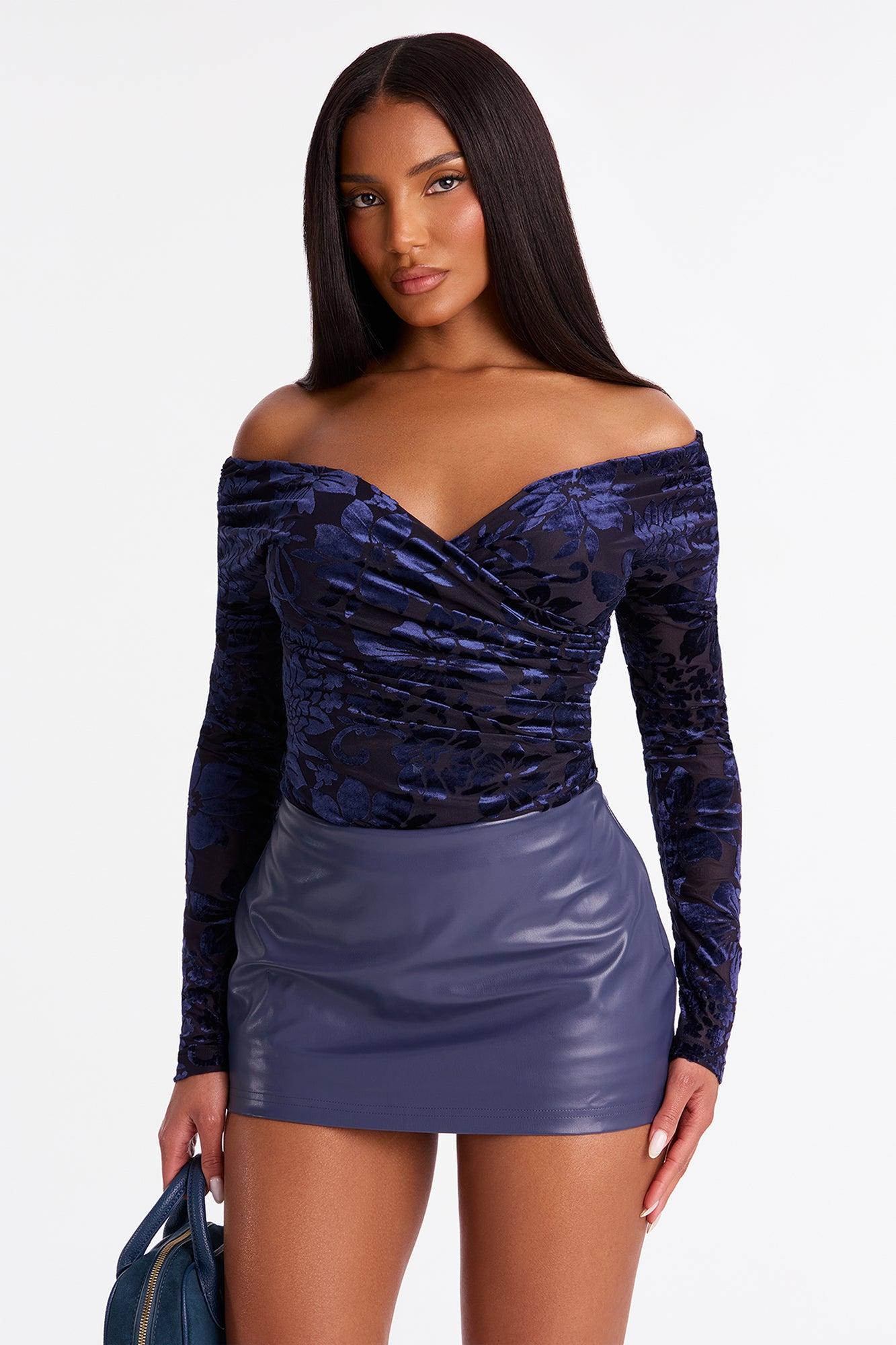 Available In Blue. Bodysuit Off Shoulder Long Sleeve Surplice Ruched Velvet Thong Bottom Snap Closure Stretch Final Sale Disclaimer: Flocking Placement May Vary. Self & Contrast: 95% Polyester 5% Spandex Lining: 93% Polyester 7% Spandex Imported