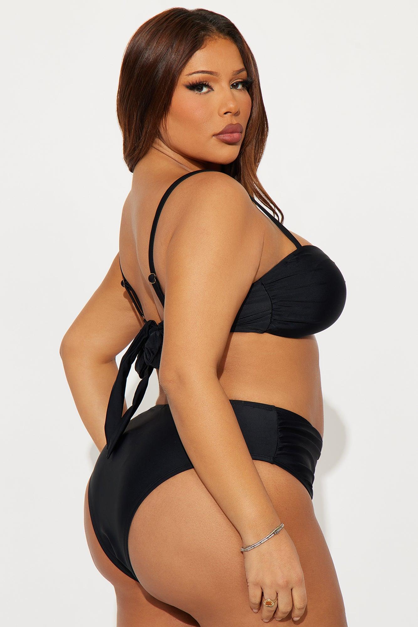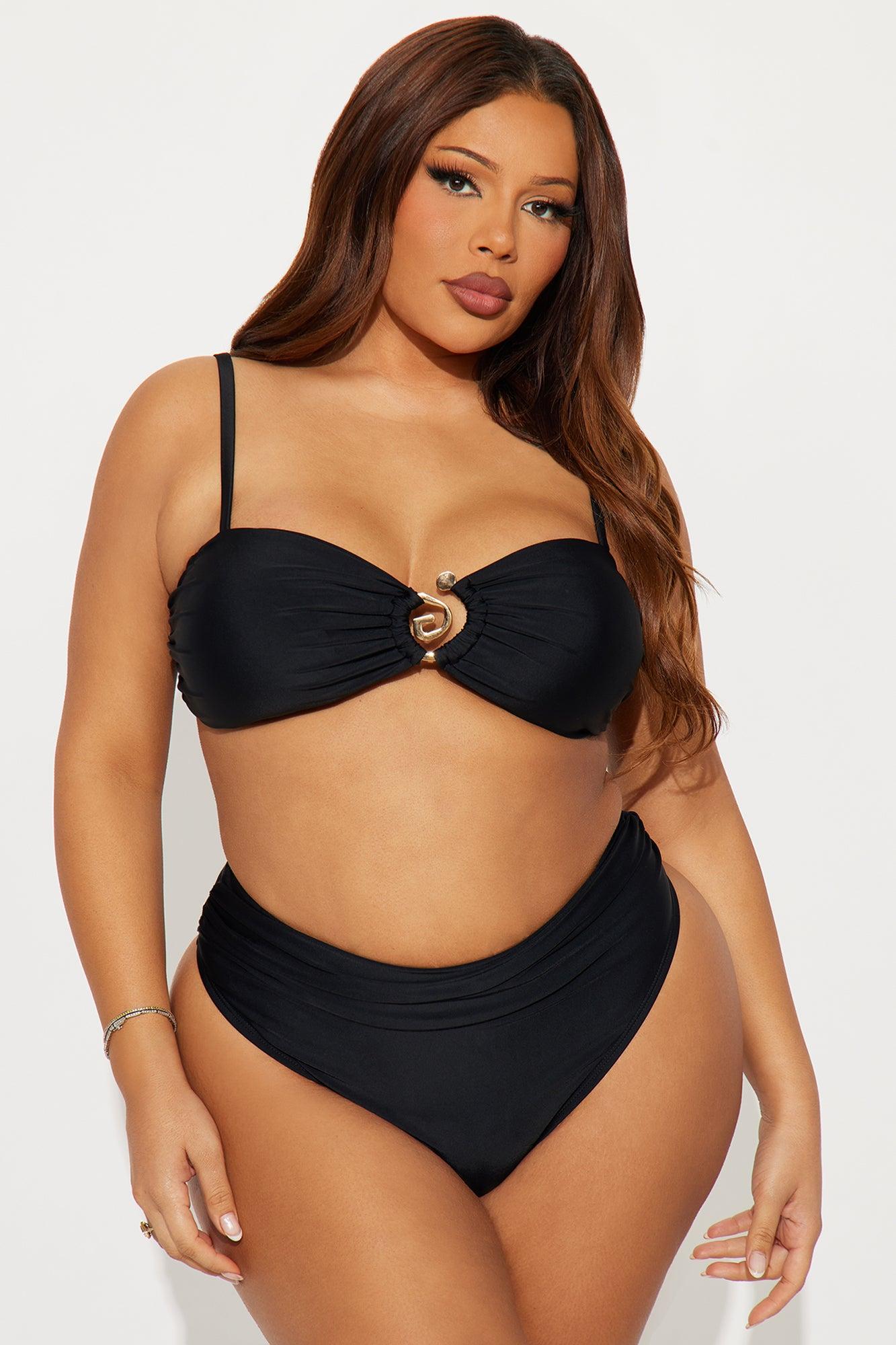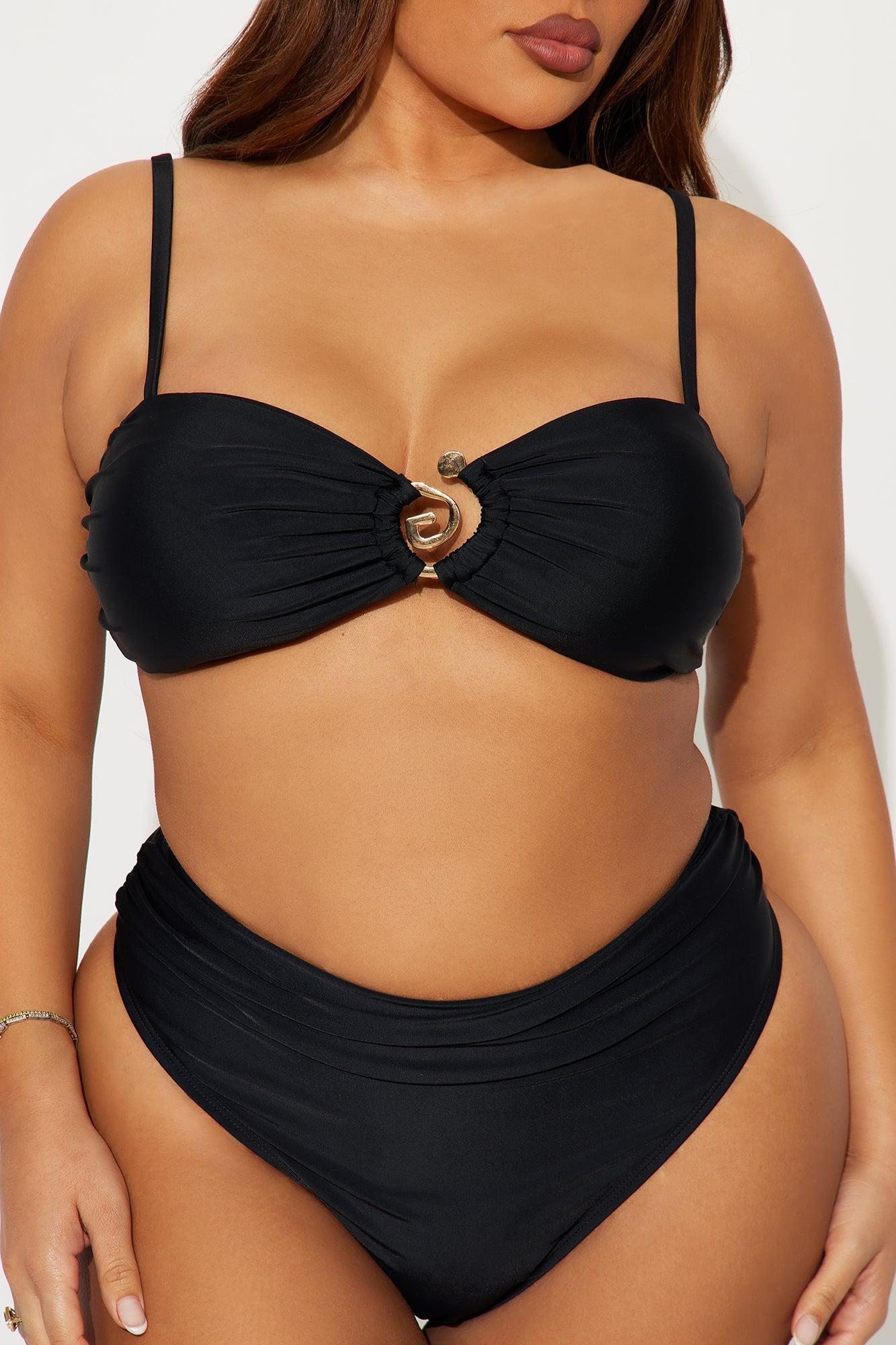 Available In Black, Lime And White. 2 Piece Bikini Bralette Bikini Top Removable Cups Adjustable Straps Ruching Detail Swirl Hardware Adjustable Back Ties Bikini Bottom/Cheeky High Waist/High Leg Cut Final Sale Full Stretch Shell : 85% Nylon 15% Spandex Lining : 92% Polyester 8% Spandex Imported