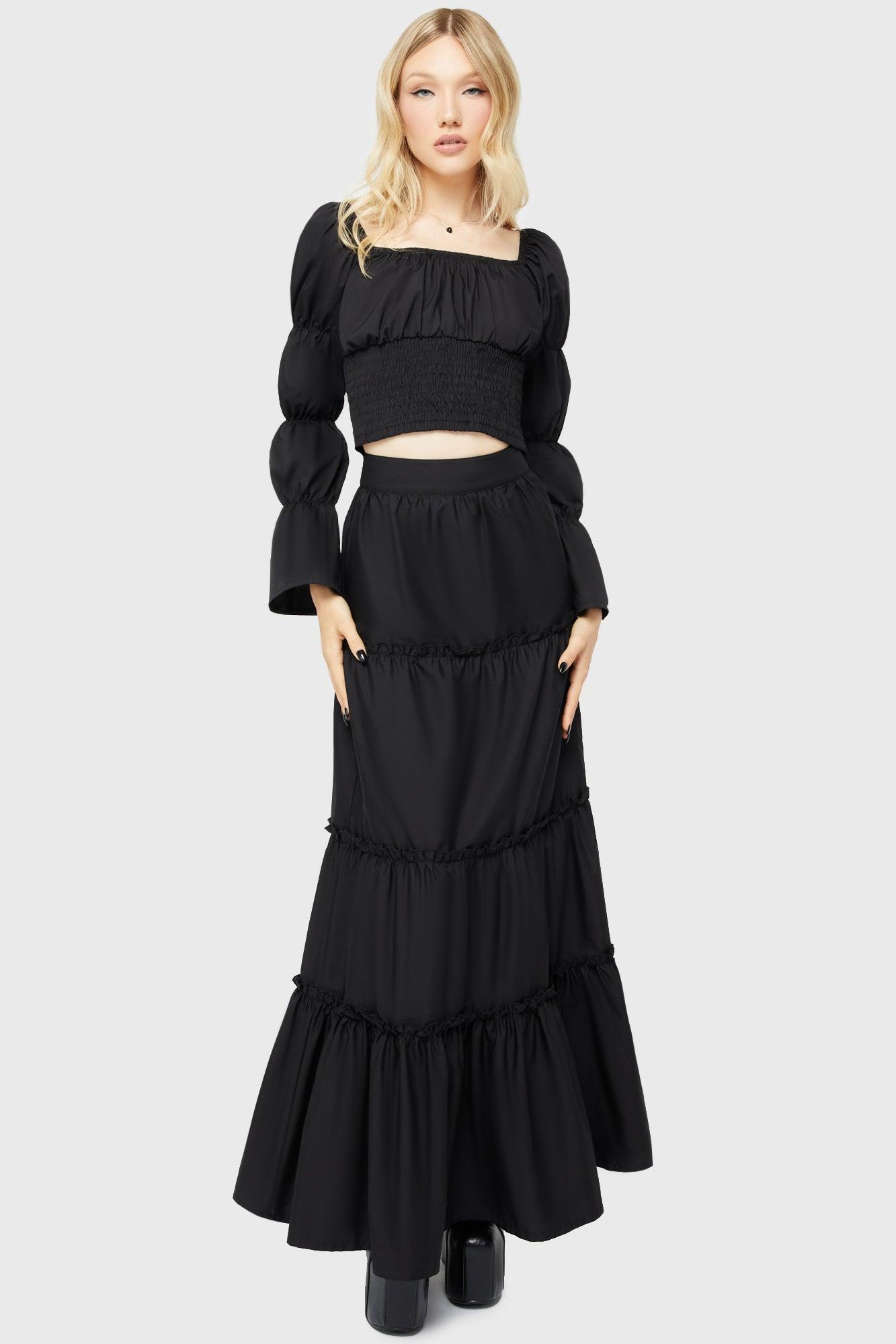 OPHIDIA - Lightweight, crisp poplin fabric.- Tiered layers with gathered decorative stitch detail.- Structured wide waistband with zip fastening for a secure, flattering fit.- Maxi length.- Designed in Brighton, England.Model is 5'10 and wears a size XS.With KILLSTAR branding, 64% Polyester 36% Cotton.Machine wash cold (30°c) / Do not bleach / Do not tumble dry / Iron at low temperature / Do not dry clean. Imported.