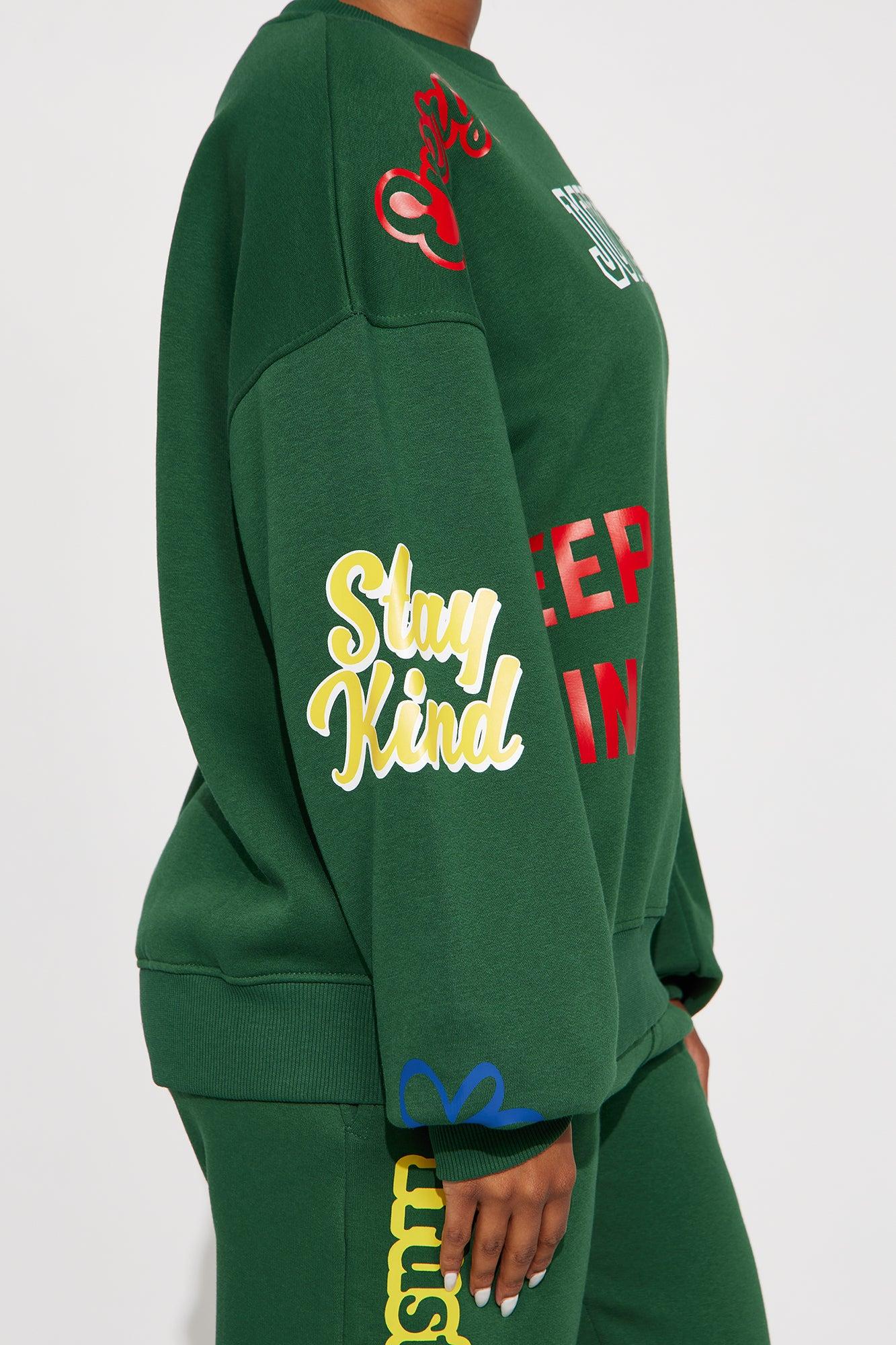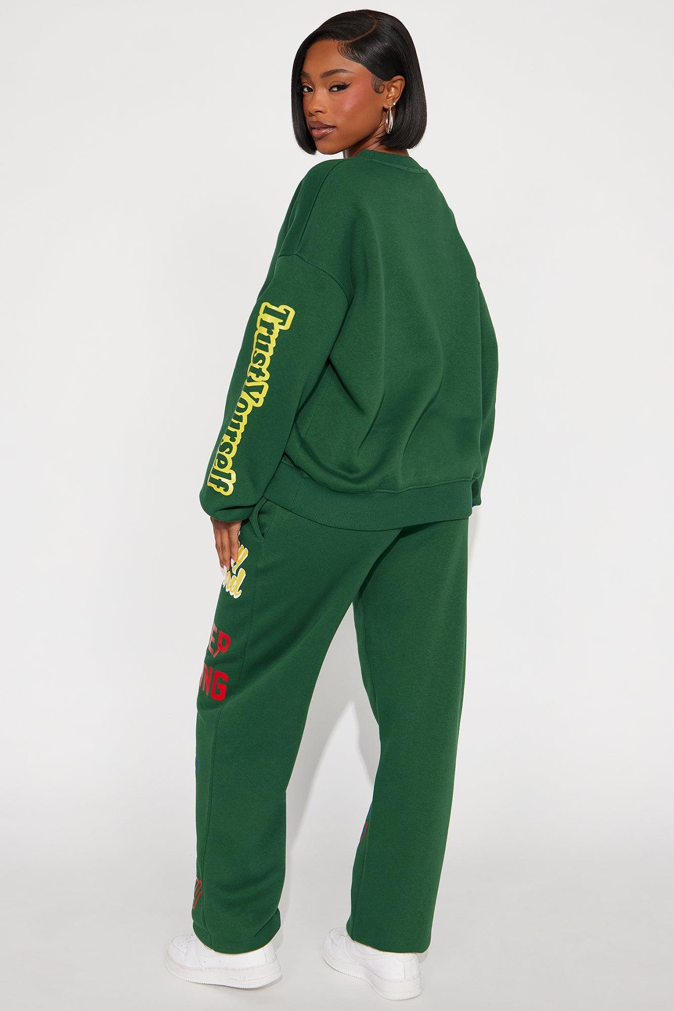 Available In Green. 2 Piece Ensemble Sweatshirt Crew Neck And Jogger Set Stretch 29" Inseam Elastic Drawstring Waistband Pockets Disclaimer: Due To The Printing Process A Difference In Saturation May Occur. Each Garment Is Unique. 60% Cotton 40% Polyester Imported