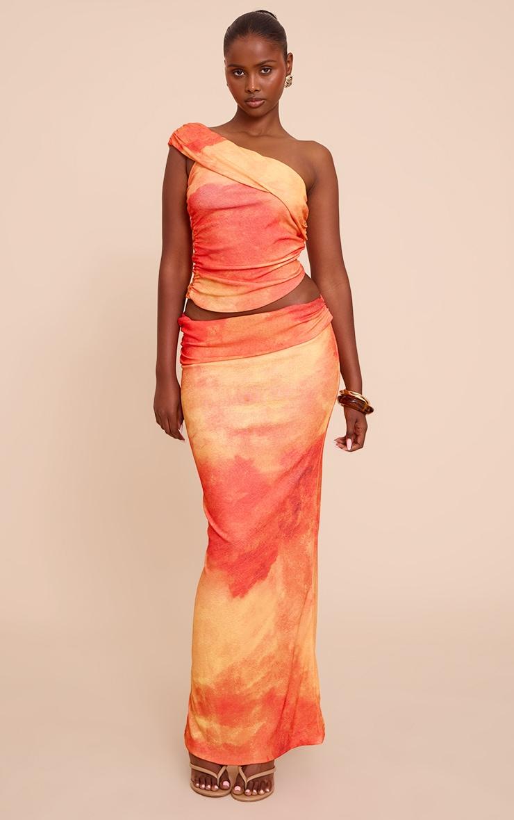 Bring asymmetry to your style with the orange abstract print onion skin ruched side asymmetric top. Made from an onion skin chiffon material, this top features ruched detailing and angled lines. Finish with slip-on heels, the matching skirt and gold jewelry for modern edge.Length approx 48.5cm/19inch (Based on sample size US 4)Model wears size UK 8/ EU 36/ AUS 8/ US 4Model Height - 5ft 9inchp]:!mb-4inch>Category: Co-ordsProduct type: Vest TopColor: OrangeMaterial: Single JerseyDesign: PlainNeckline: AsymmetricSleeves: SleevelessOccasion: Evening