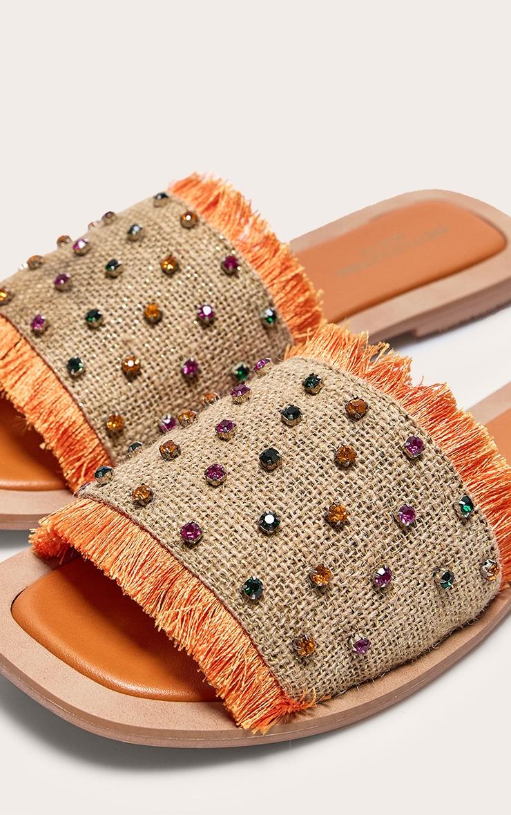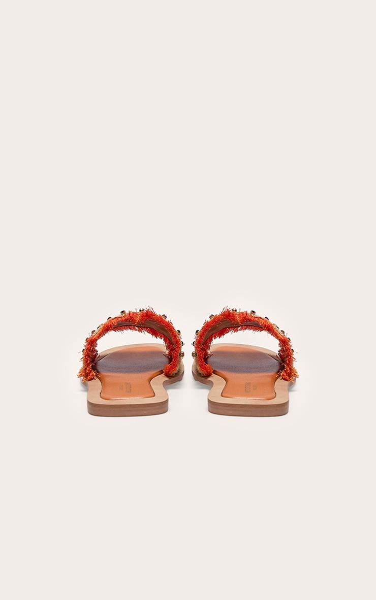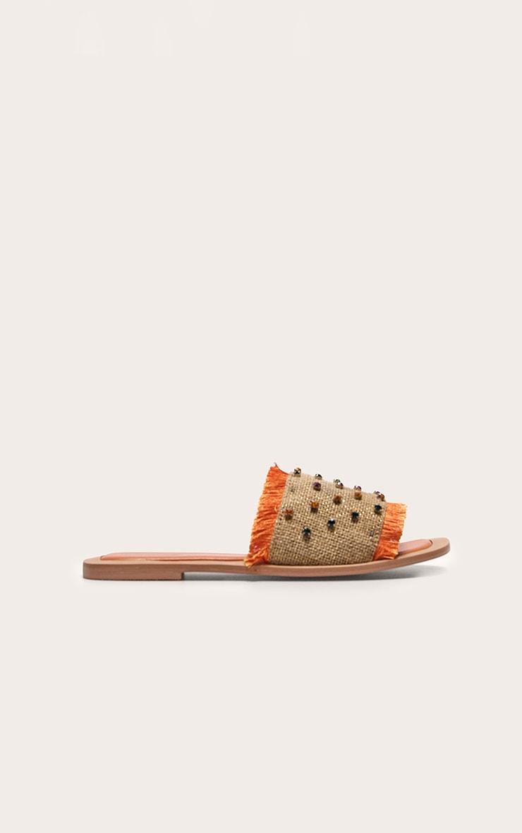 Brighten up your shoe collection with these orange wide fit round toe raffia fringed diamante woven flat mule sandals. Made from an orange woven material with a wide fit, a round toe design, a raffia fringe and diamante detailing, how can you resist? Just add these flat mules to your outfit of the day for the perfect finishing touch to any look. Raffia Slip-on p]:!mb-0inch>Category: FootwearProduct type: Wide Fit FlatsColor: OrangeOccasion: Day