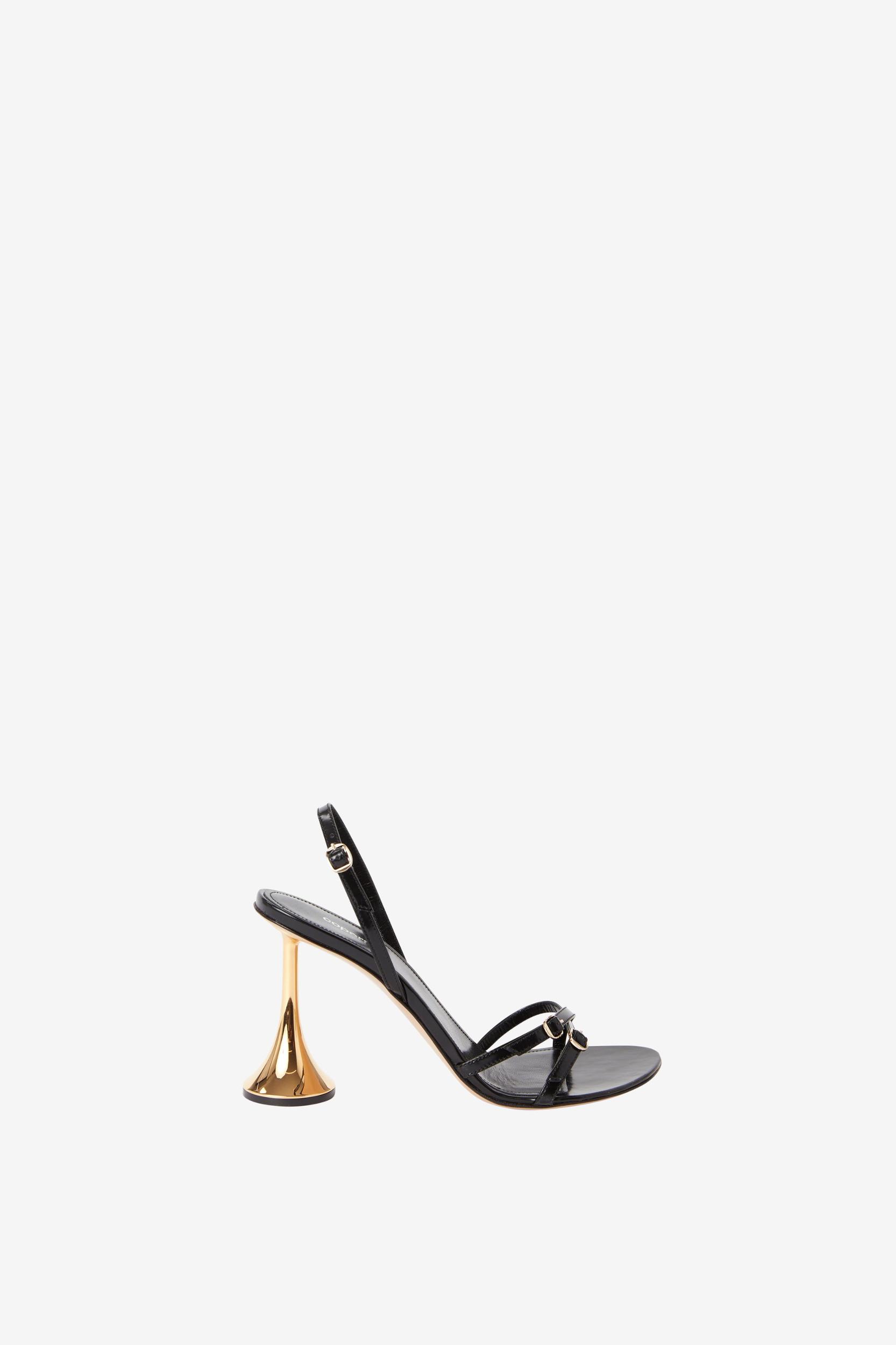 Coperni’s SS24 catwalk collection was inspired by classic instruments and contemporary sound technologies. These Orchestra sandals are so-named for their golden heels shaped like upside-down trumpets, lending their minimal silhouette an avant-garde edge. The sandals are crafted from smooth black leather and the two top straps are adorned with small silver buckles.