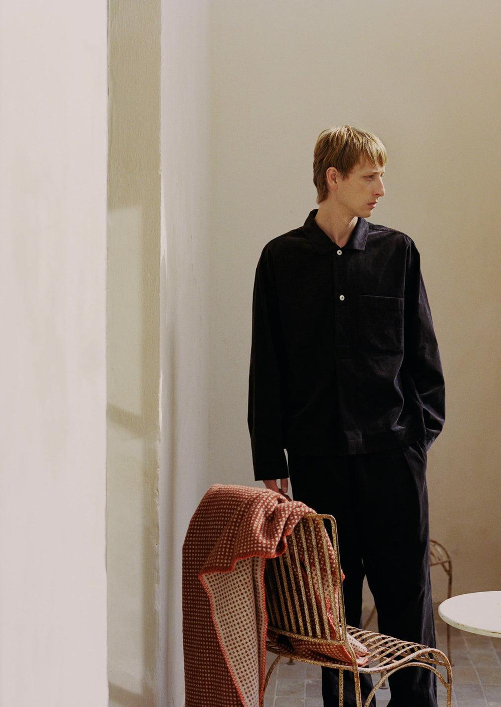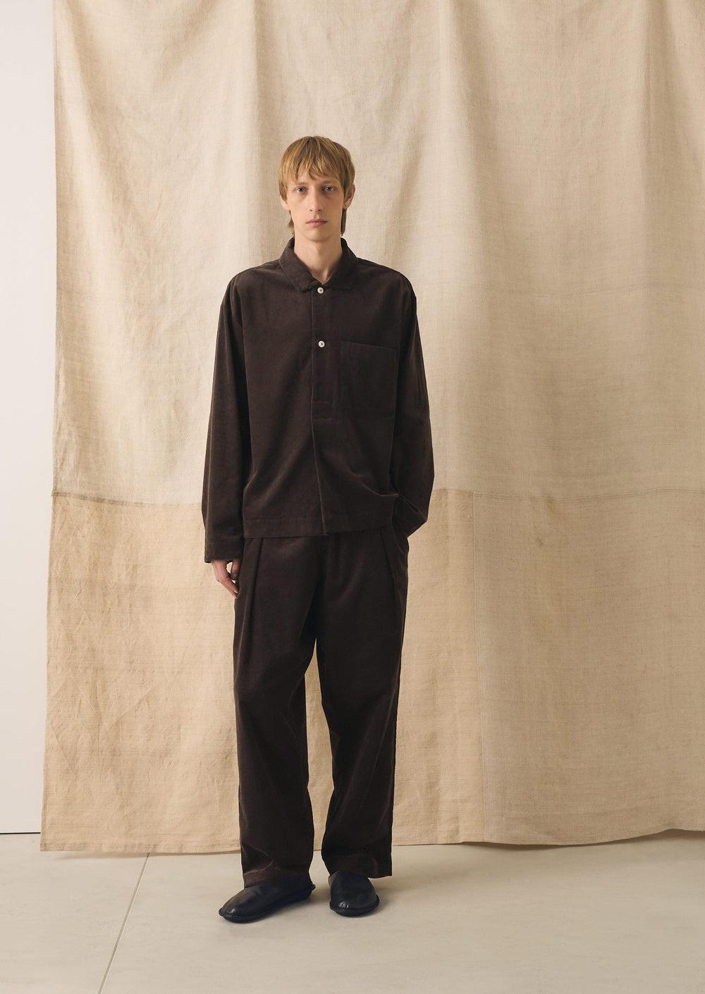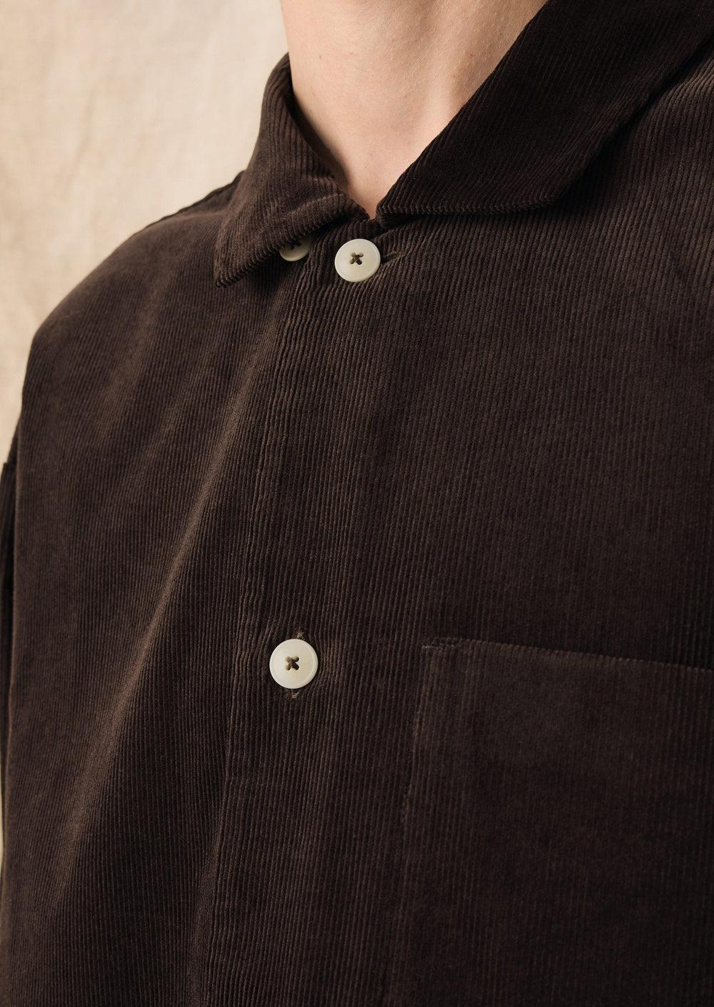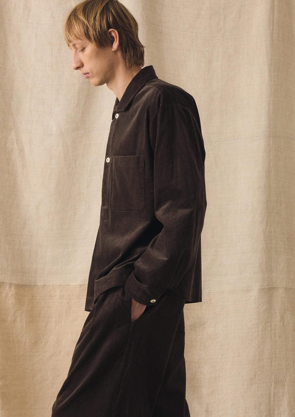 Organic cotton cord. Relaxed fit. Subtle knife pleat. Half placket. Loop and button closure. Chest patch pocket. Corozo buttons.