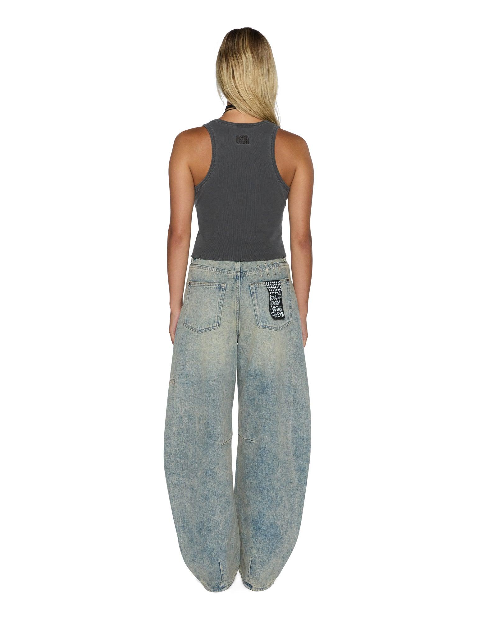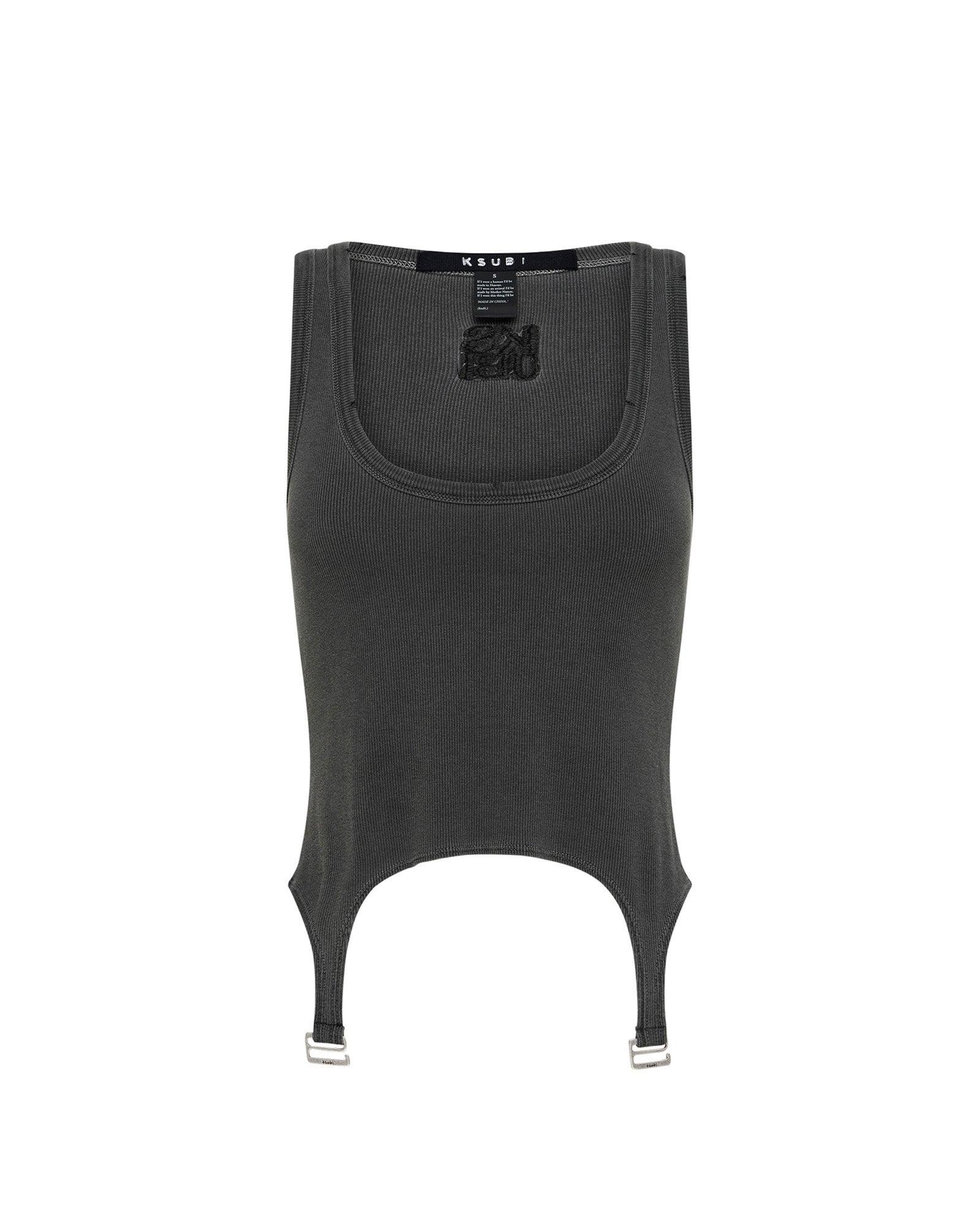 The Origin Tank Garter Charcoal is a scoop-neck fitted tank top, with a racerback design. Made from premium lightweight cotton rib, it features garter-style straps at the front hem, finished with Ksubi-branded hardware. Additional details include Ksubi stacked embroidery at the back neck and signature T-box embroidery. An elevated branded essential that pairs effortlessly with any Ksubi denim.