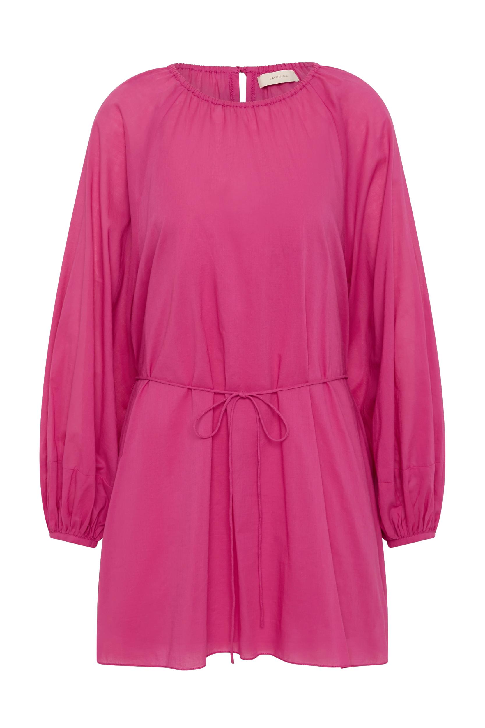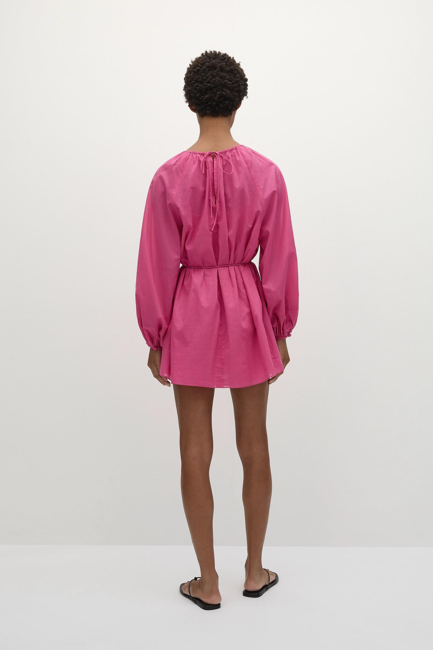 A sweet mini dress with a high rounded neckline and long balloon sleeves, elasticated at the cuff. There is a small keyhole opening at the back neck with thin tie details and a waist tie detail for custom cinching. There is no elastic at the waist, so it can be tied as loosely or tightly as desired. The silhouette is relaxed with a soft skirt that crops short on the body and a separate slip lining. Designed from a delicate cotton voile in a vibrant cerise pink, style with a simple sandal for island vacations. This style is true to size. It can be worn with or without the waist ties for a custom fit.