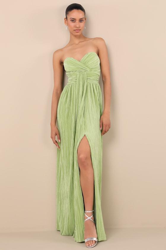 Crafted from glossy plisse satin, this gown was made to swoon over with its flattering sweetheart neckline and strapless, surplice-style bodice. The high, banded waist boasts sash-like detail at the center that flows into the stunning maxi skirt with an alluring side slit for effortless movement. Hidden no-slip strips and back zipper/clasp.