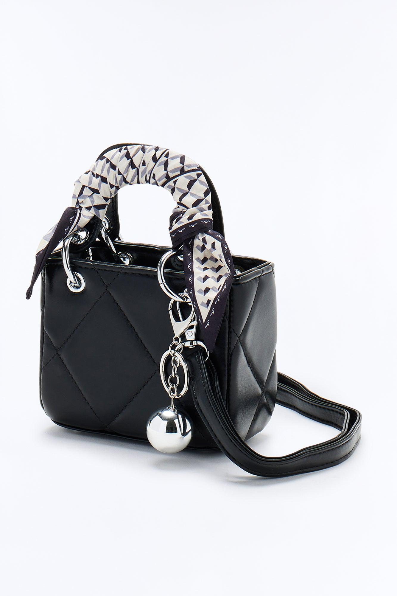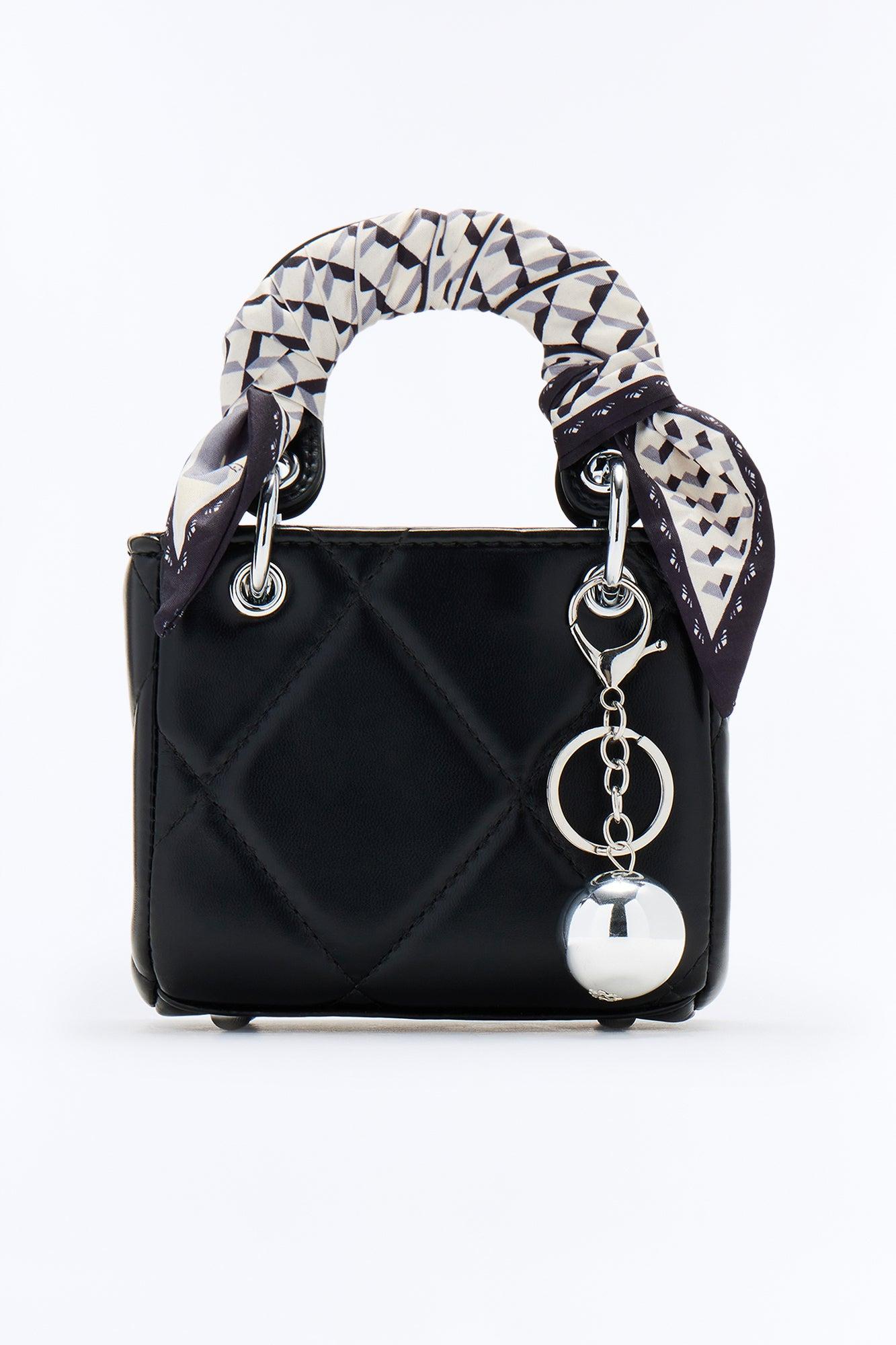 Available In Black And Burgundy. Mini Satchel Bag Top Zip Closure Faux Leather Material Quilted Pattern Scarf Handle Detail Dimensions: 5" x 2.5" x 8" Imported California Proposition 65WARNING: Cancer and Reproductive Harm - www.P65Warnings.ca.gov.