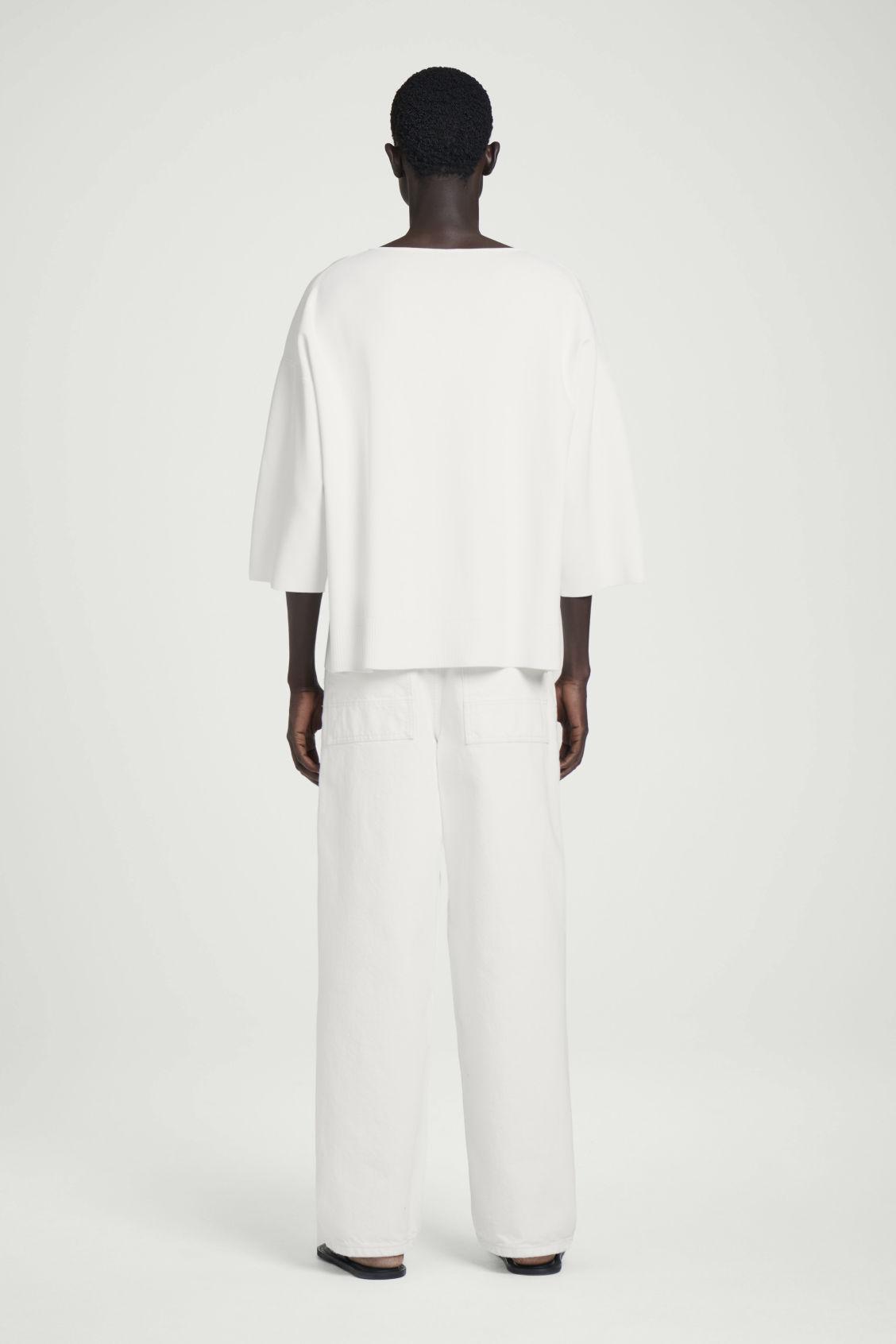 Reframing knitwear for summer, this oversized jumper is designed with short sleeves and a modern boat neck. It's finely knitted in a 16-gauge stitch and comes in a subdued white tone that's easy to style. Oversized fit, 16g knitRecycled nylon (polyamide) reduces our demand on limited natural resources and reduces greenhouse gas emissions Shell: 65% Viscose, 35% Recycled polyamide (Recycled nylon). Excluding trims / Machine wash Back length of size M is 65cm / Model wears a size M