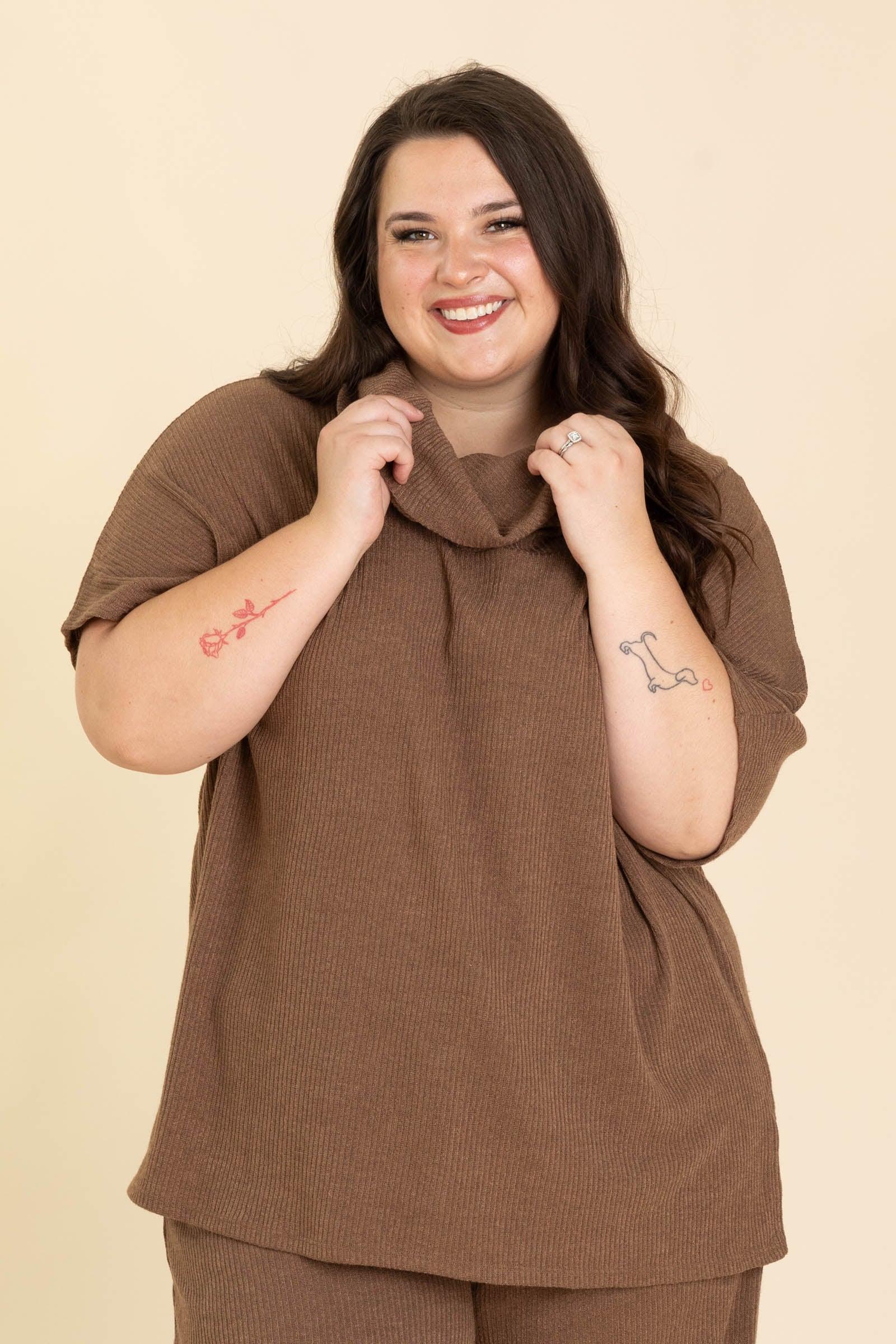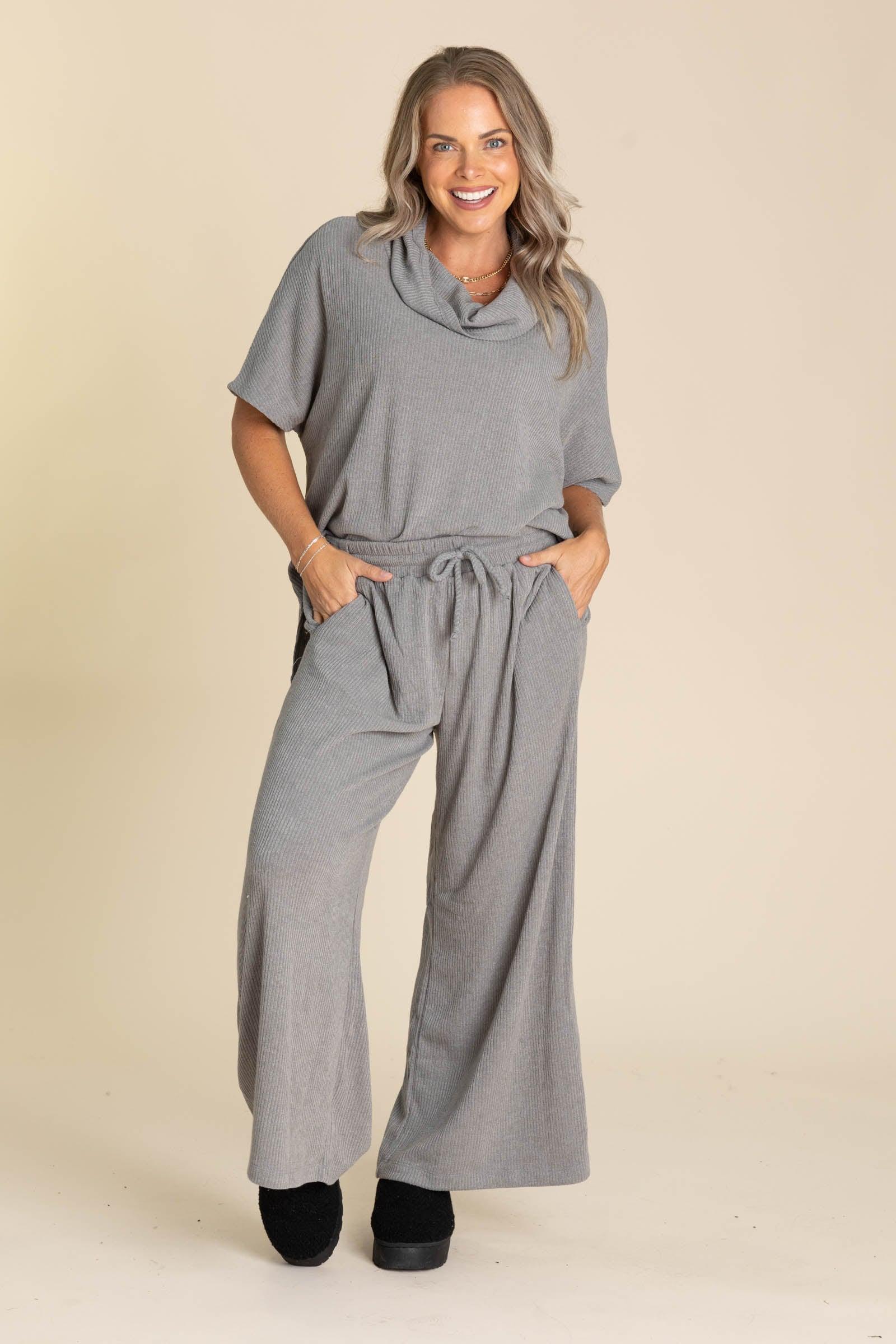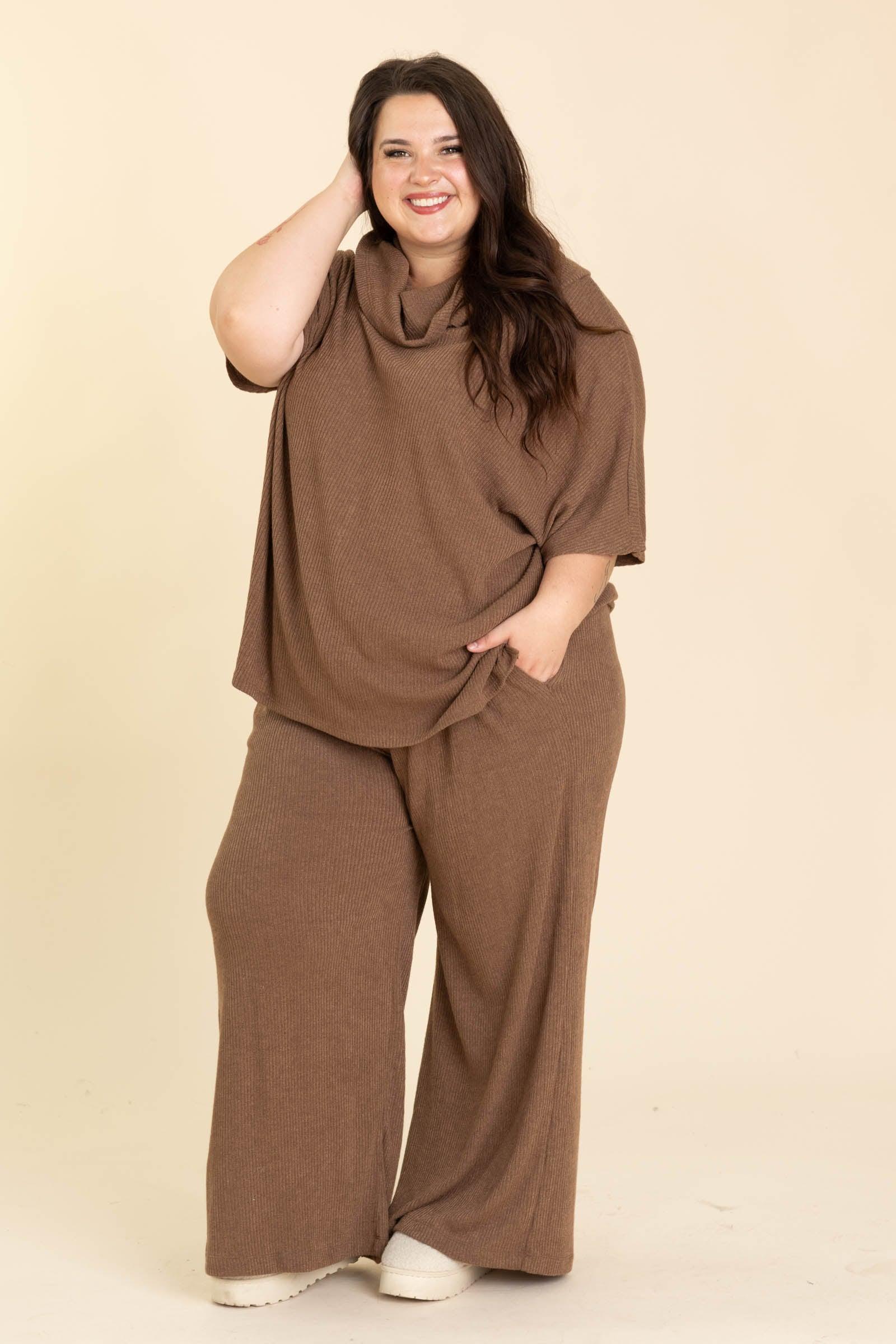 Product Details Color: Black/ Chocolate/ Heather Grey Print: Solid Ribbed Neckline: Cowl Sleeves: Short Sleeve Hemline: Straight 2 Piece Set Brand: Dear Scarlett Material and Care 83% Polyester 14.5% Rayon 2.5% Spandex Hand Wash Cold Hang or Line Dry Size and Fit Top Small: Bust 54" Waist 52" Length 27" Medium: Bust 55" Waist 53" Length 27" Large: Bust 56" Waist 54" Length 28" X Large: Bust 57" Waist 56" Length 28" 2X Large: Bust 59" Waist 57" Length 29" 3X Large: Bust 60" Waist 58" Length 29" Bottom Small: Waist 26" Rise 12" Inseam 27.5" Medium: Waist 28" Rise 12" Inseam 27.5" Large: Waist 30" Rise 12" Inseam 27.5" X Large: Waist 32" Rise 12.5" Inseam 27.5" 2X Large: Waist 34" Rise 12.5" Inseam 27.5" 3X Large: Waist 36" Rise 13" Inseam 27.5" Erica is 5’7” and wearing her true size small Kristen is 5’2 and wearing her true size X Large