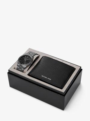 From the Slim Runway Collection. Secured with a tri-link bracelet, Michael Kors gunmetal-tone stainless steel watch flaunts a round case, black sunray dial, and three-hand movement. A Saffiano leather wallet is included with this sophisticated timepiece. Quartz movement Polished bezel Black sunray dial Stick hour markers Second hand Gunmetal-tone stainless steel Deployant buckle International two-year limited warranty Made in Japan FEATURES Water-resistant to 5 ATM Model number: MK1044 SIZE Round case, 44mm (1.7) Bracelet width, 22mm (0.8). Fine Jewelry - Fashion Watches > Michael Kors > Saks Fifth Avenue > Barneys. Michael Kors. Color: Gunmetal.
