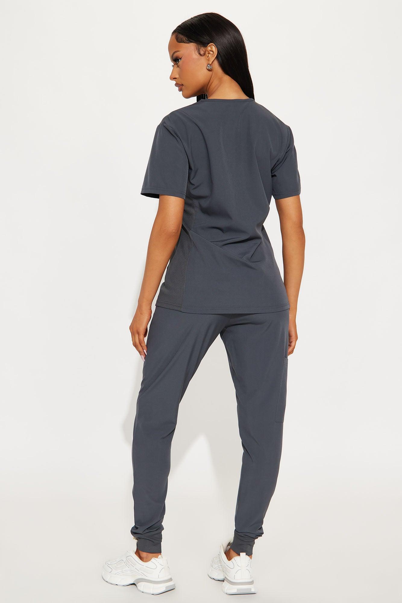 Available In Lilac, Charcoal, And Brick Red. Scrub Set Short Sleeve Top V Neck Ribbed Side Panels Matching Joggers Drawstring Waistband Pockets Stretch 93% Polyester 7% Spandex Imported California Proposition 65WARNING: Cancer and Reproductive Harm - www.P65Warnings.ca.gov.