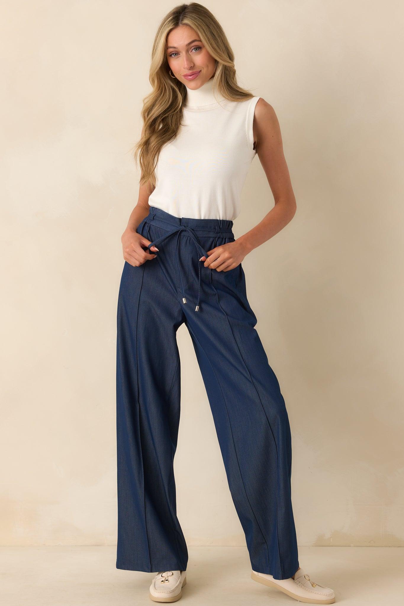 Owning The Room Dark Wash High Waisted Denim Pants are made for moments when you want to feel unstoppable. They’re bold, flattering, and give you that just-right boost of confidence every time you wear them. These dark wash pants feature a high rise waist, an elastic waist insert, a hook and bar button closure, functional zipper closure, small belt loops, thing optional self-tie belt, center leg seam details, and functional front and back pockets.