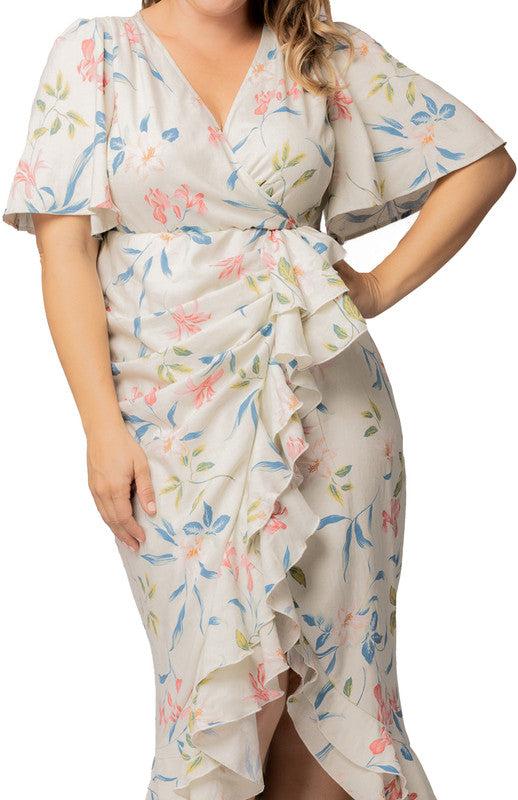Embrace effortless elegance in the Plus Size Alexandra Faux Wrap Gown. Made from a lightweight rayon/linen woven fabric, this dress features a flattering high-low faux wrap design, surplice V neckline, and short flutter sleeves. Draping through the upper skirt and flounce detail at the hem create a soft, feminine silhouette.
