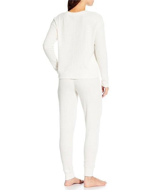 From Papinelle, this lounge set features: Top: Solid waffle-textured knit fabrication V-neckline Long sleeves Pullover construction Viscose/polyester/elastane Machine wash/tumble dry low Bottom: Solid waffle-textured knit fabrication Relaxed fit Side pockets Elastic waistband Drawstring tie closure Pull-on construction Approx. 30" inseam Viscose/polyester/elastane Machine wash/tumble dry low Imported.