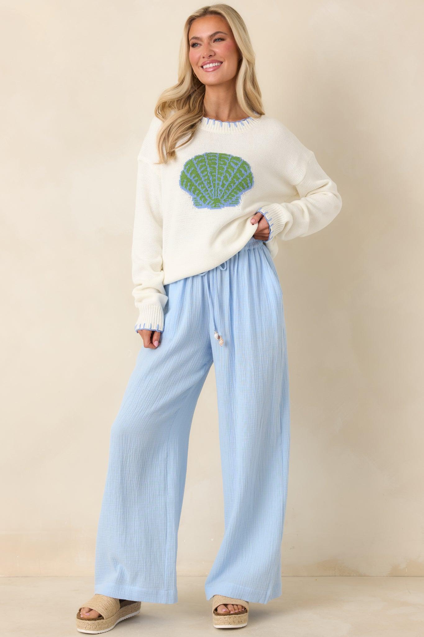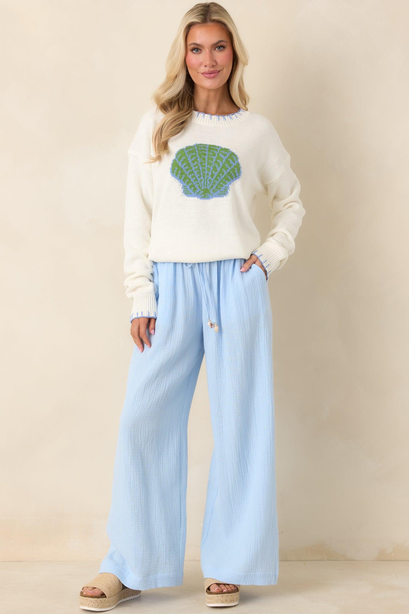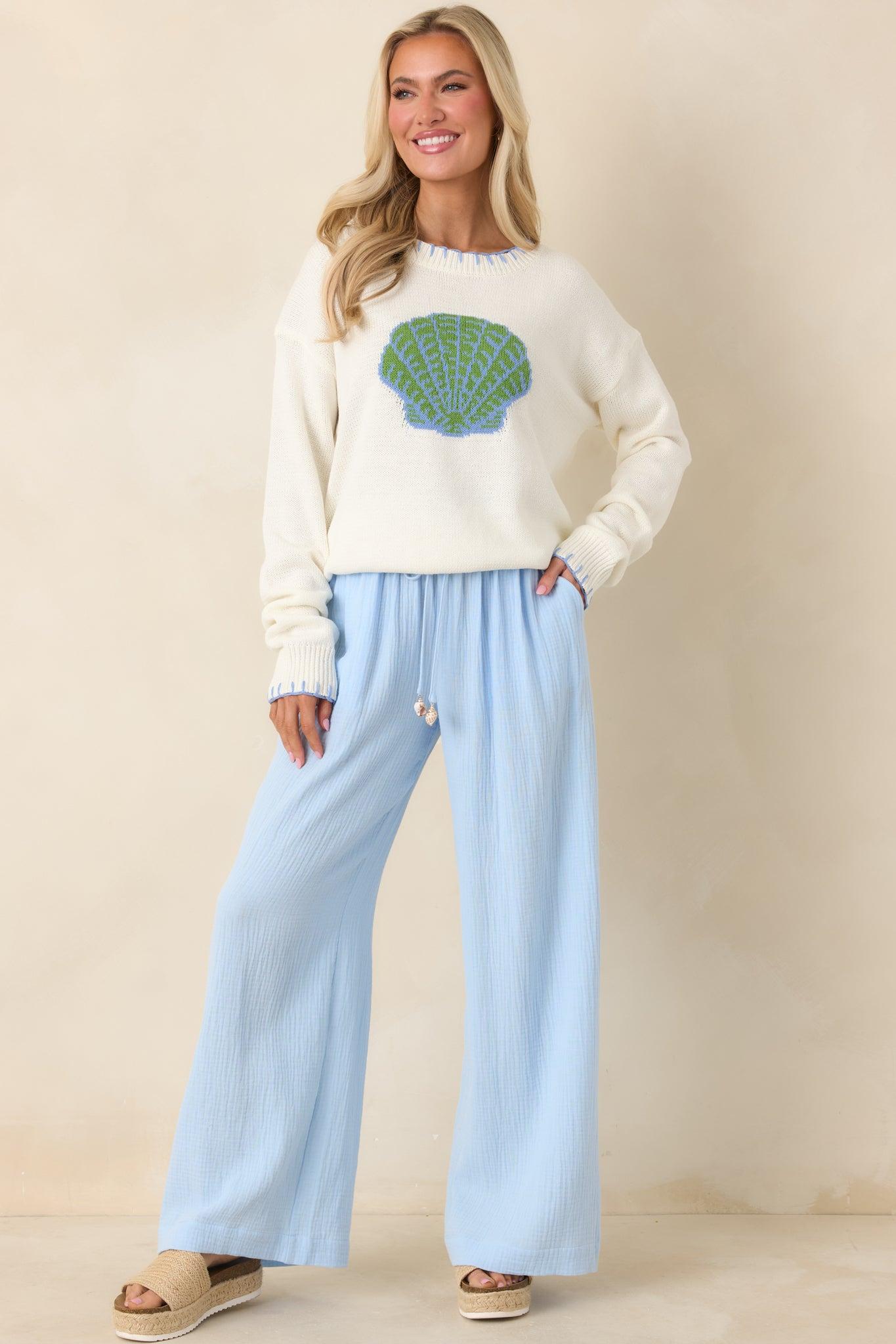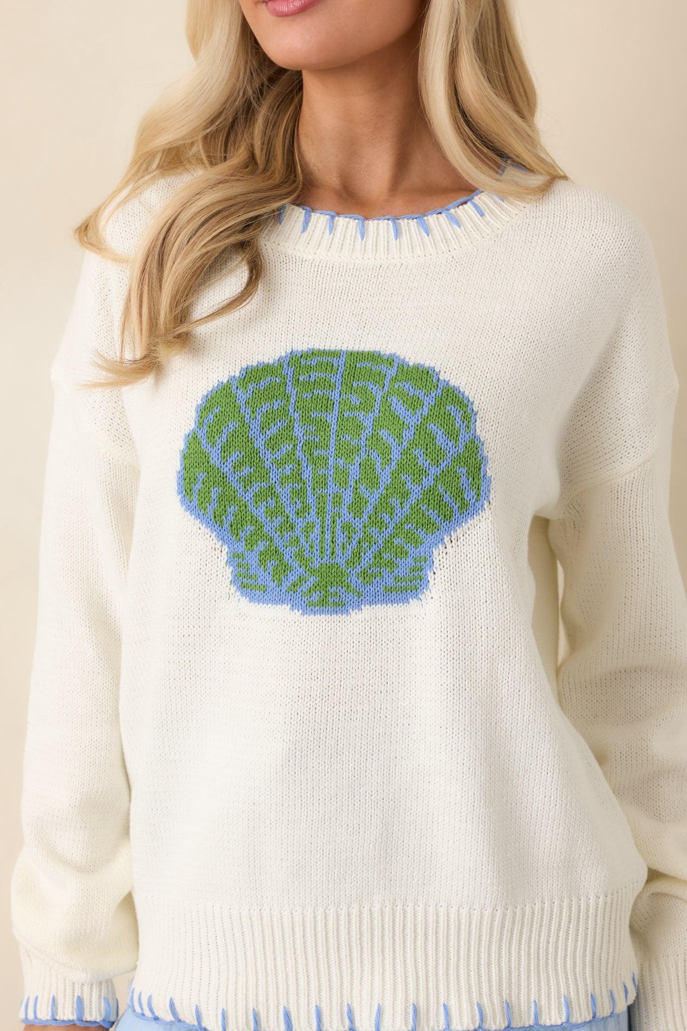 Meet your forever vacation sweater. The Paradisa Shell Island Knit Sweater brings seaside charm to everyday styling with its soft white knit and bold green-and-blue shell motif. Finished with contrast whipstitch trim at the neckline, cuffs, and hem, it feels playful yet polished — like something you’d throw on after sunset by the water, barefoot and glowing. This white knit sweater features a relaxed fit with a round neckline and ribbed trim accented by contrast whipstitch detailing. A statement shell graphic is knit into the front, adding texture and subtle dimension. Designed with long sleeves and a soft, midweight knit fabrication, it offers comfortable wear with a slightly easy drape. 55% Cotton & 45% Acrylic Unlined Machine Wash Cold Manufactured in China Designed in the USA Model is 5'8" and wearing size small