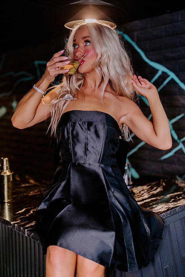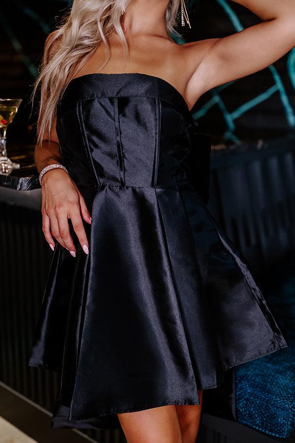 - Make a bold fashion statement with this chic dress! - Unlined material with a satin finish - A strapless neckline with an interior non-slip strip - A bodice with structured boning and side zip closure - Pleated skirt detail - A large statement bow on the back - A figure flattering silhouette that ends in a rounded mini dress length silhouette with pleated detail