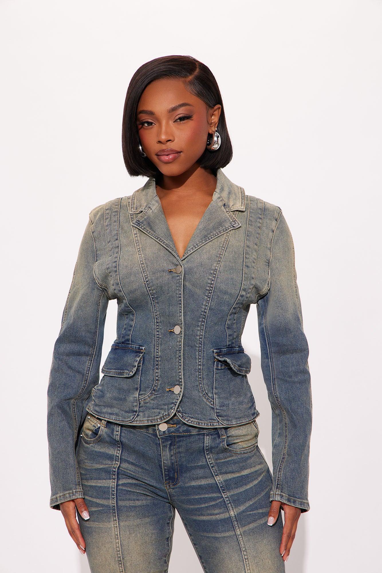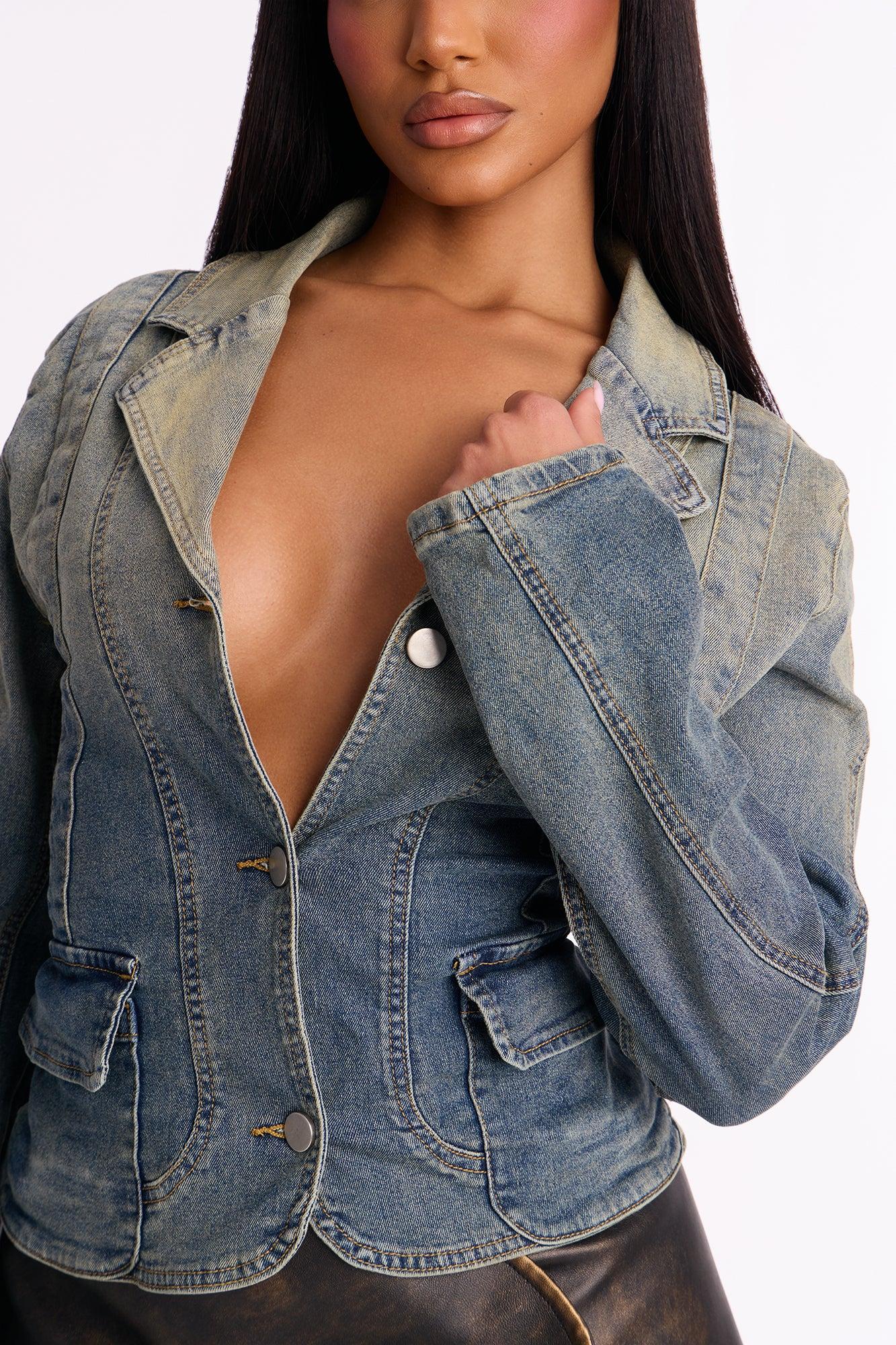 Available In Vintage Wash. Pair With Paris Low Rise Stretch Flare Jeans Denim Blazer Tinted Collared Button Closure Front Pockets Medium Stretch Disclaimer: Due To The Wash Process, Each Garment Is Unique. 80% Cotton 18% Polyester 2% Spandex Imported