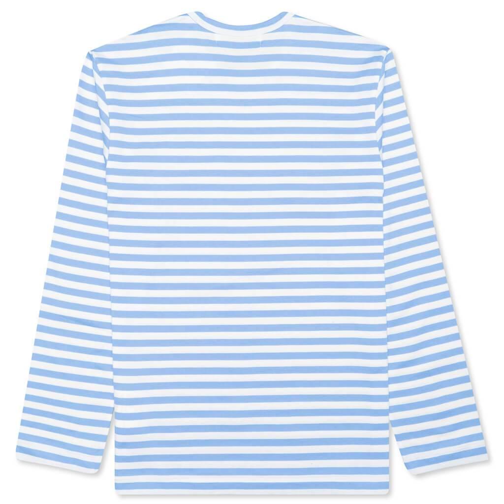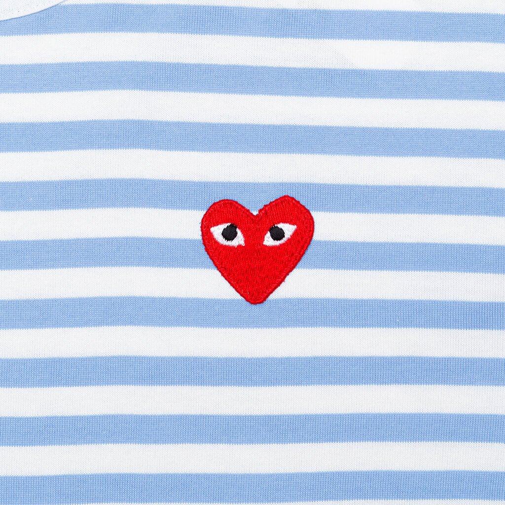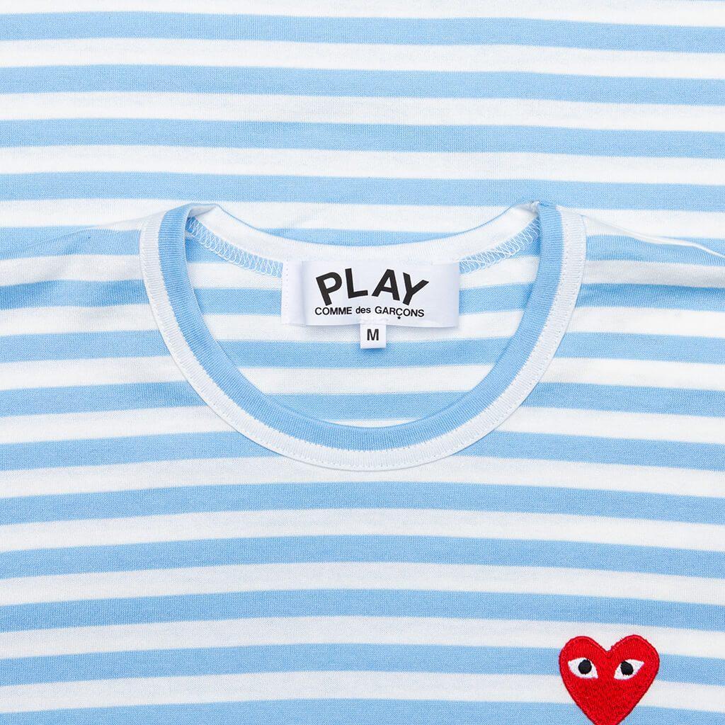 The concept of the Comme des Garcons PLAY line is design by not designing. Characterized by the iconic red heart logo designed by artist Filip Pagowski, the line is a collection of unisex basics, fragrances, and footwear for those who enjoy simplicity. Pictured is the Comme des Garcons PLAY Pastelle Women's Striped L/S Shirt in Blue. AZ T277 051 1 COMME DES GARCONS PLAY APPAREL HAS A SMALLER FIT, WE RECOMMEND SIZING UP. 100% Cotton Ribbed collar Embroidered branding Made in Japan Style no: AZ-T277-051-1 condition: new