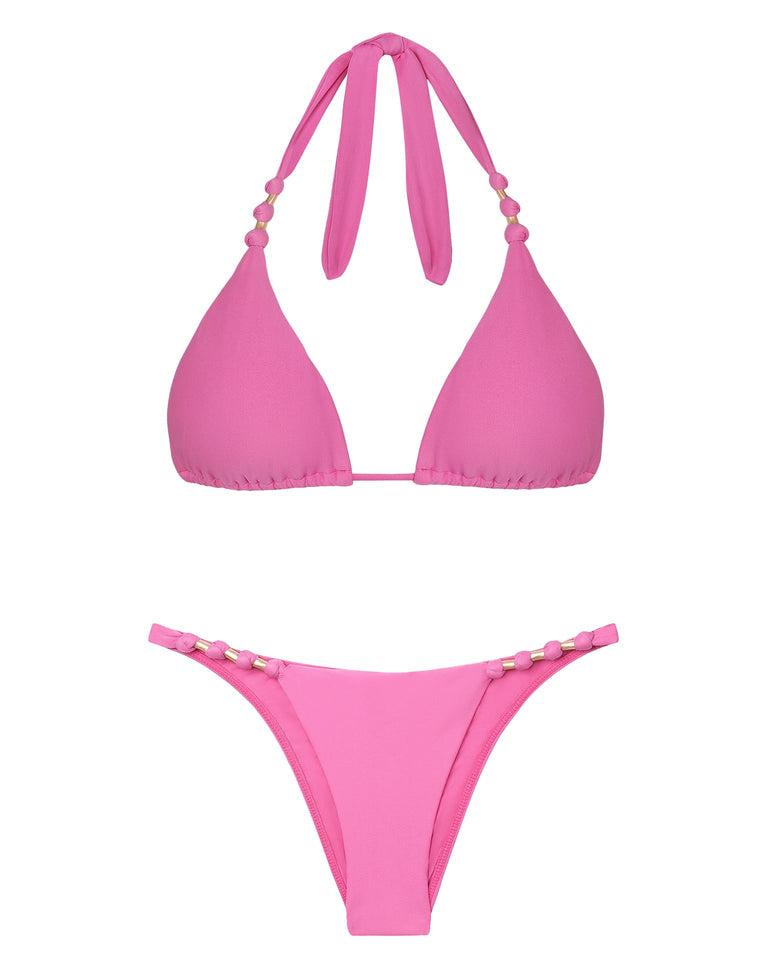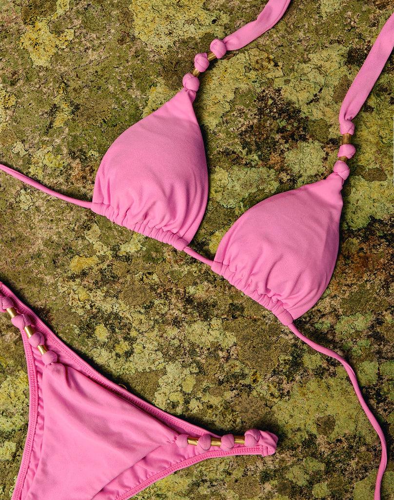 This subtle and sensual top raises the bar on the classic tri with hand-crafted detailing that will raise your swimwear to new heights. Pair your bikini with the Perola Short Cover up for a put together look. Features: Adjustable triangle top Hand-crafted knotted halter neck tie with 24k dipped gold ring accents Halter
