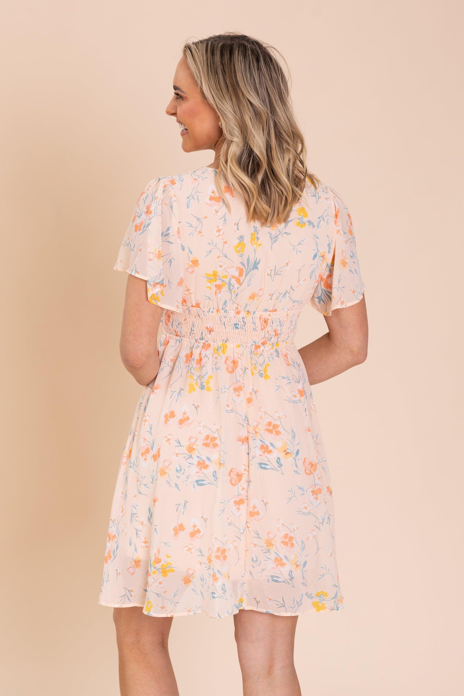 Product Details Colors: Peach, Yellow, Light Teal, White, Dark Peach Print: Floral Neckline: V-Neck Sleeve: Short Sleeve Hemline: Straight Brand: Mittoshop Material and Care 100% Polyester Lining: 100% Rayon Hand Wash Cold Hang/Line Dry Size and Fit Small: Bust 30" Waist 26" Length 36" Medium: Bust 32" Waist 28" Length 36.5" Large: Bust 34" Waist 30" Length 37" Model is 5'8 and wearing her true size small