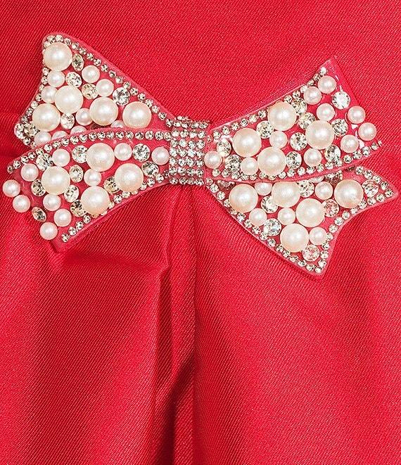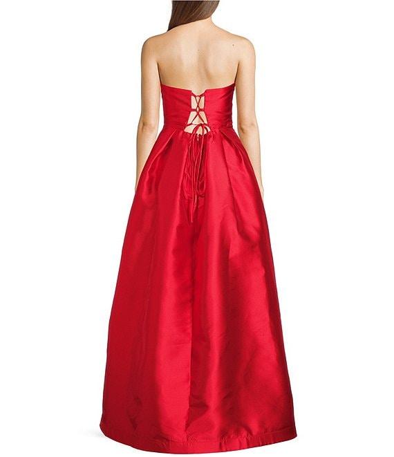 From Pear Culture, this ballgown features: Satin fabric Strapless silhouette Embellished bow trim at waist Side slit Zip-back closure 52" center-back length Polyester Hand wash/line dry Imported.