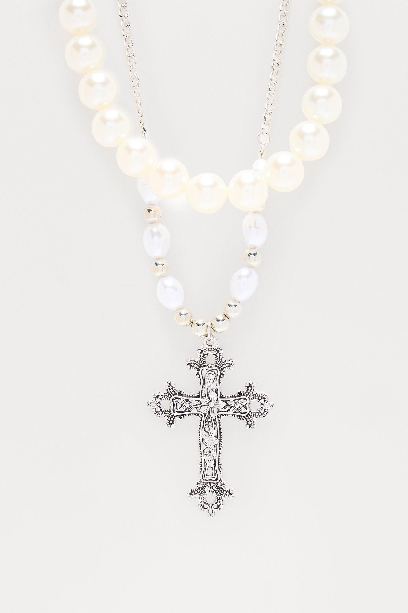 Available In Silver. Layered Necklace Pearl Detail Religious Motif Lobster Clasp Closure Imported California Proposition 65WARNING: Cancer and Reproductive Harm - www.P65Warnings.ca.gov.