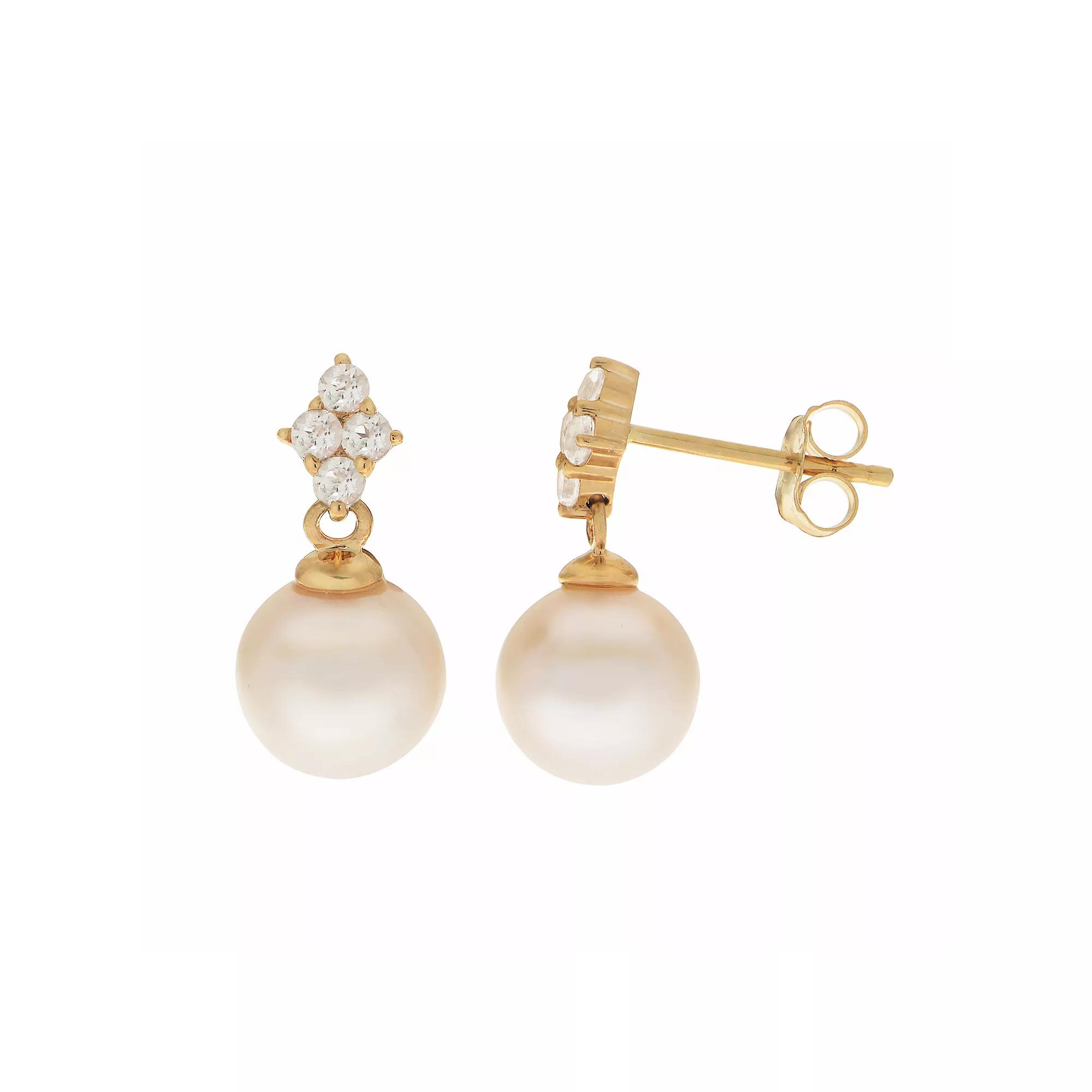 Adorned with freshwater cultured pearls and genuine white topaz accents, these 14k gold drop earrings offer timeless elegance.EARRING DETAILS Length: .6 in. Backings: post Metal: 14k gold Packaging: boxed CULTURED PEARL DETAILS Type: freshwater Shape: round Size: 8-8.5 mm Color: whiteSTONE DETAILSStone type: white topazTotal weight: 1/3 ct.Shape: roundSetting: prongGemstones may have been treated to enhance their appearance. Special care may be required. Please visit our Gemstone Treatment & Special Care Guide for more information. Size: One Size. Gender: female. Age Group: adult.