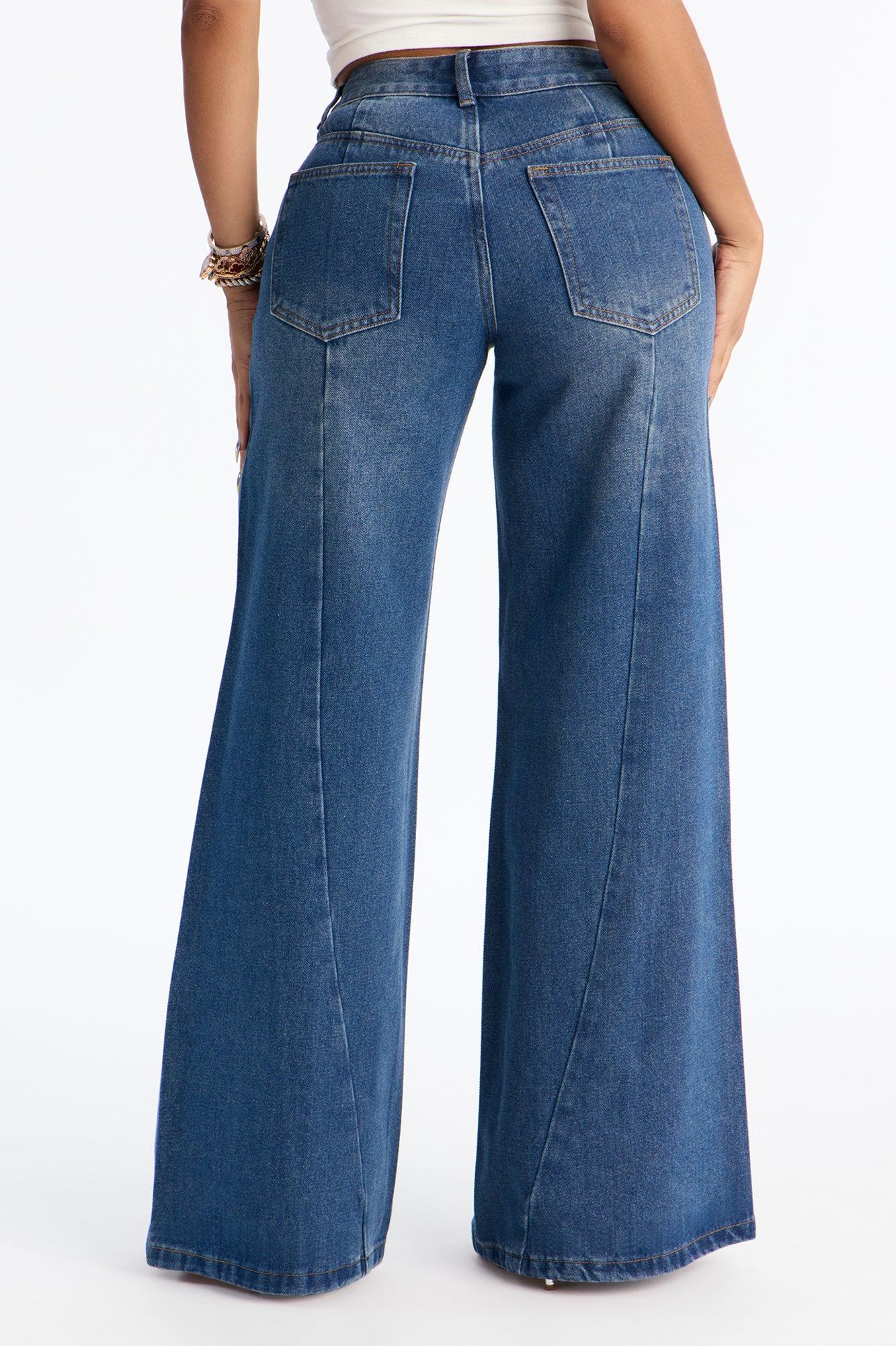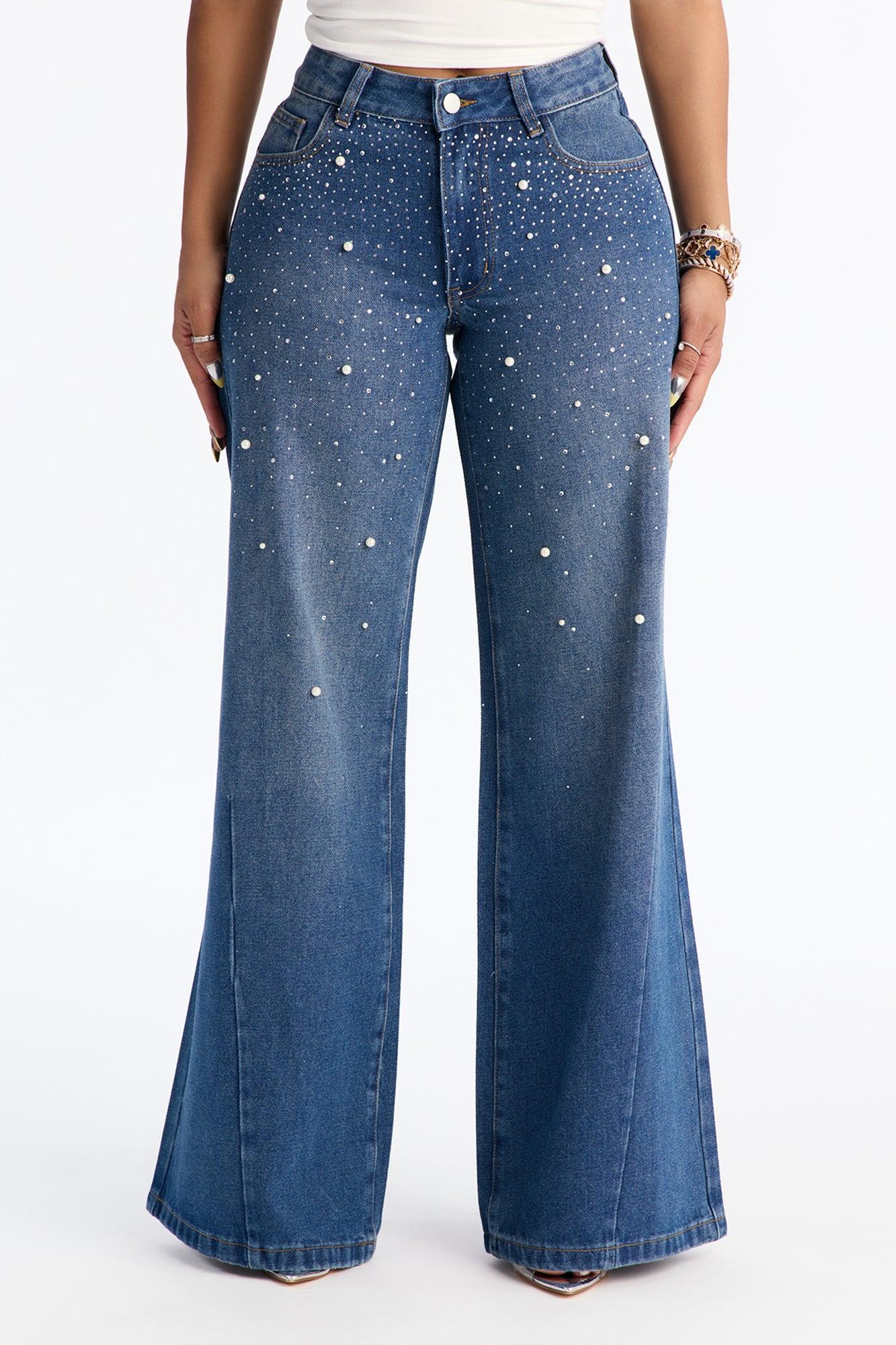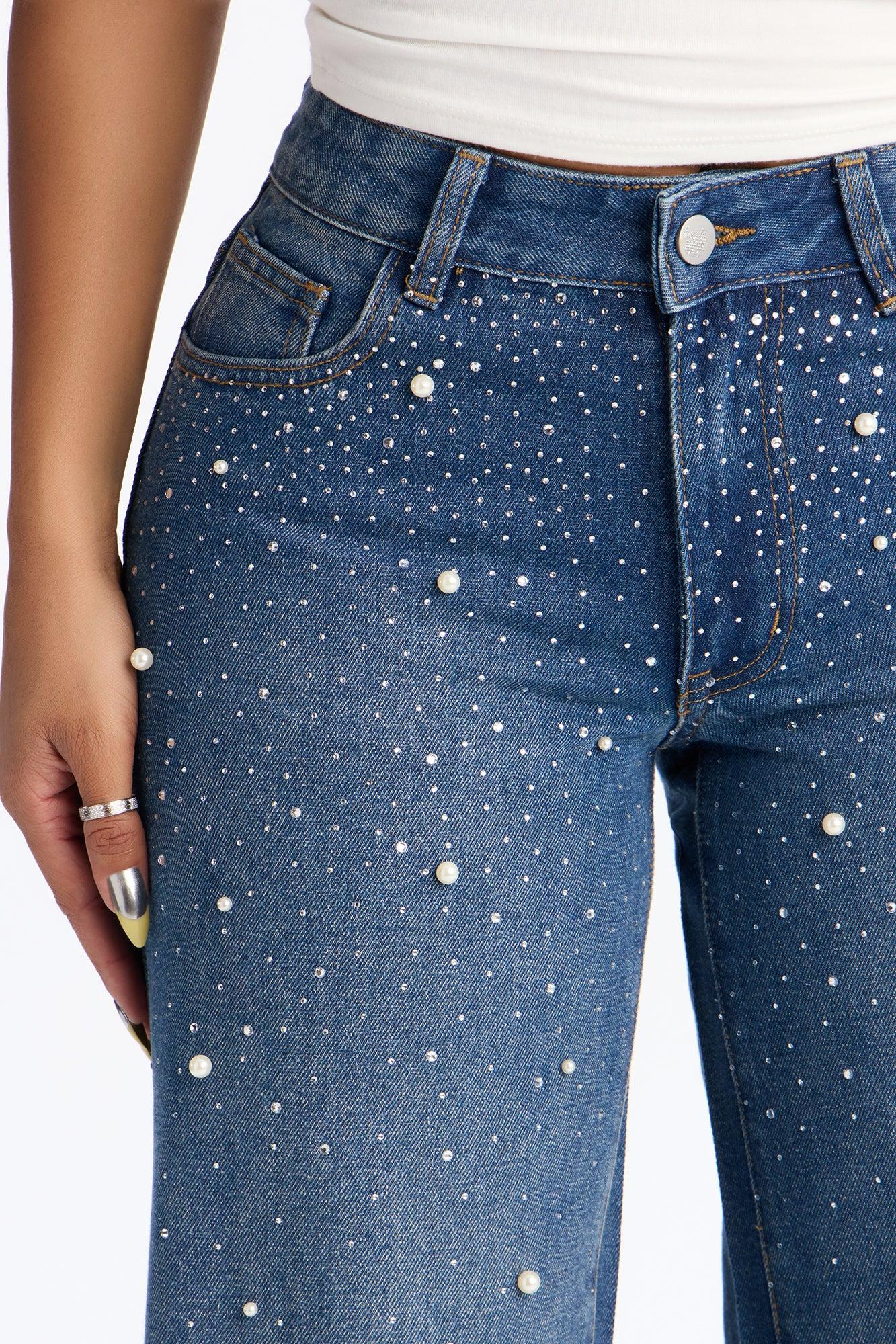 Pearly Whites Embellished Low Waist Wide Leg Jeans - Vintage Wash Female