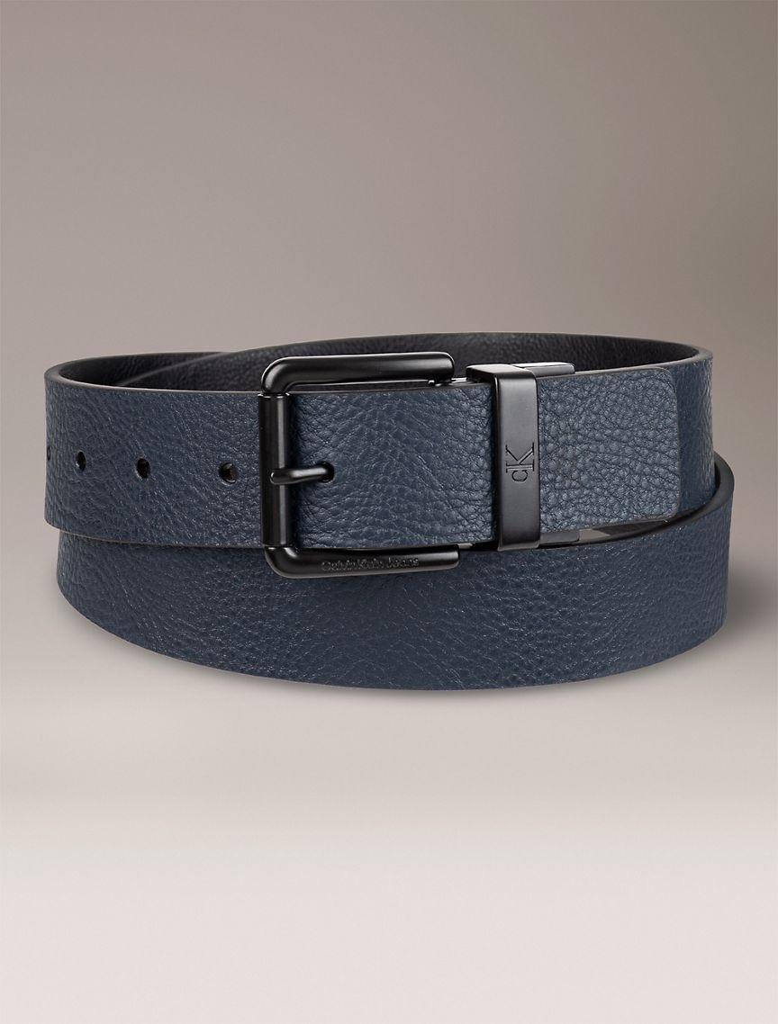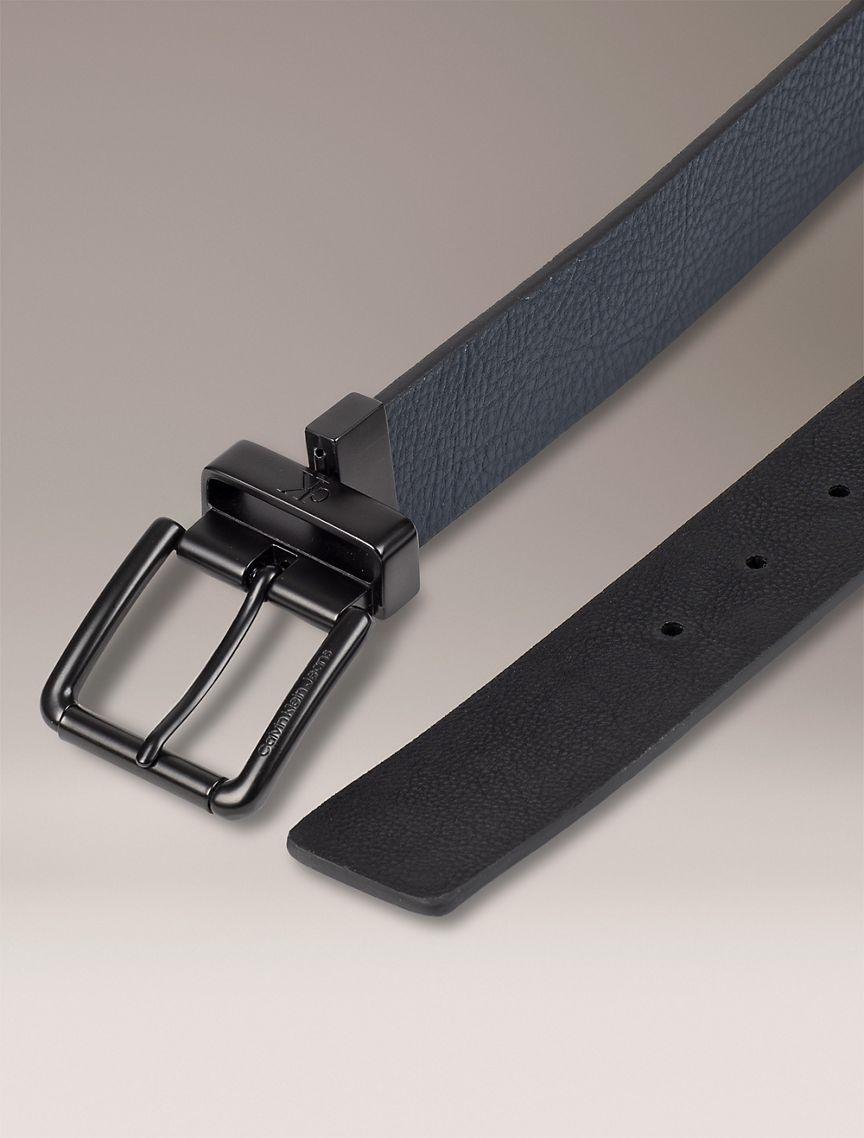 A sleek, reversible belt for versatile wear. Features a black matte finish roller buckle, engraved monogram logo on the strap keeper and a pebble-grain strap for added dimension.