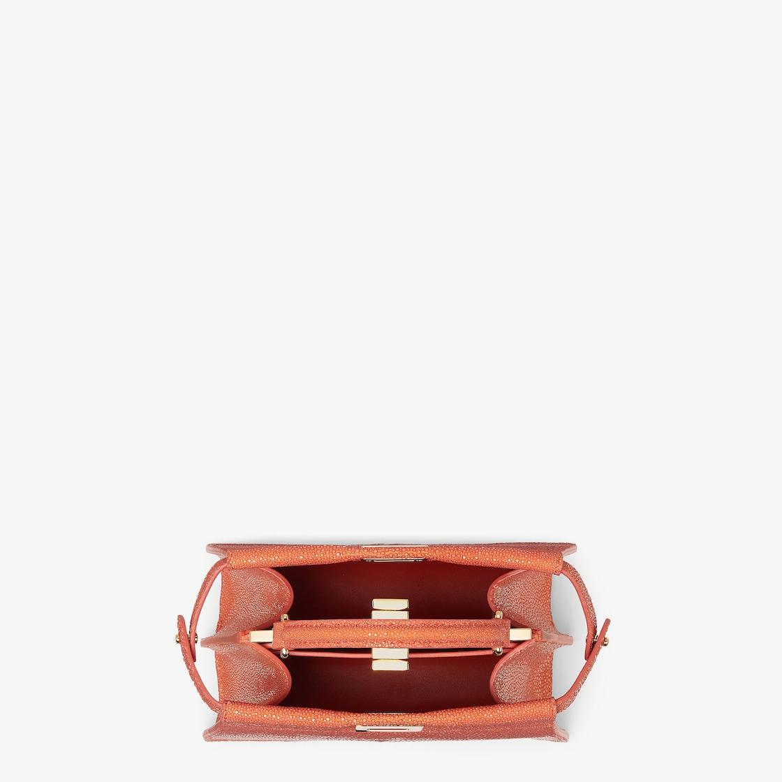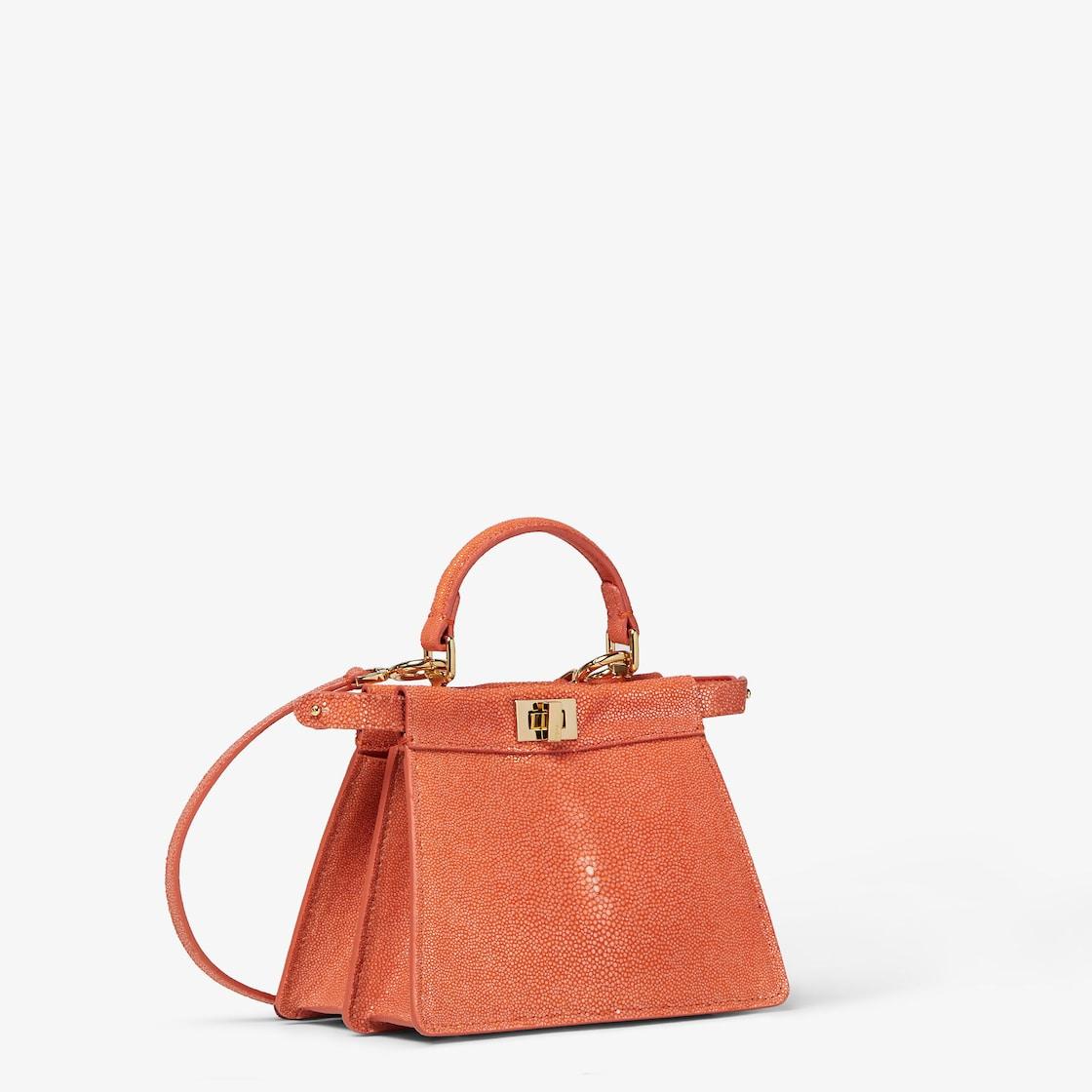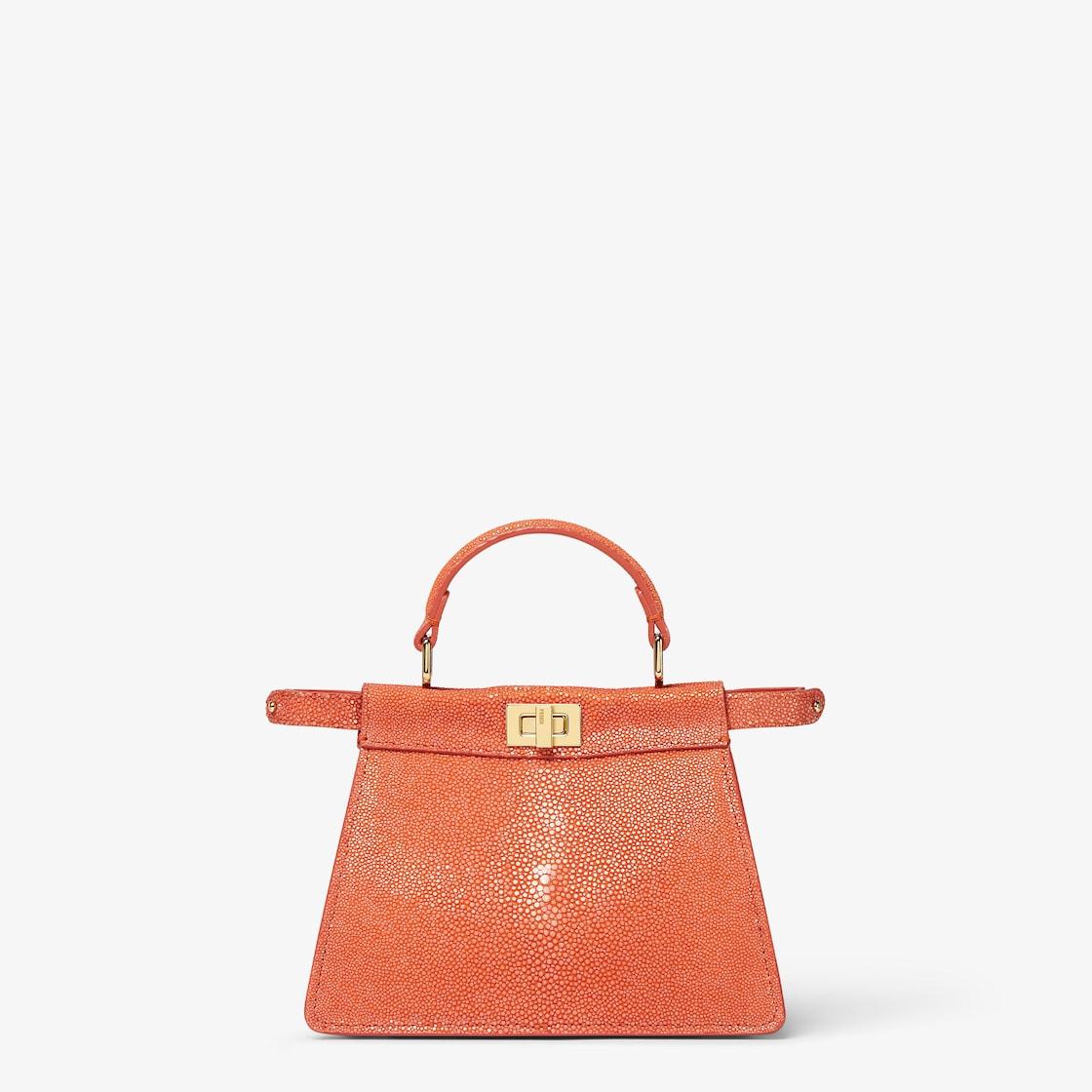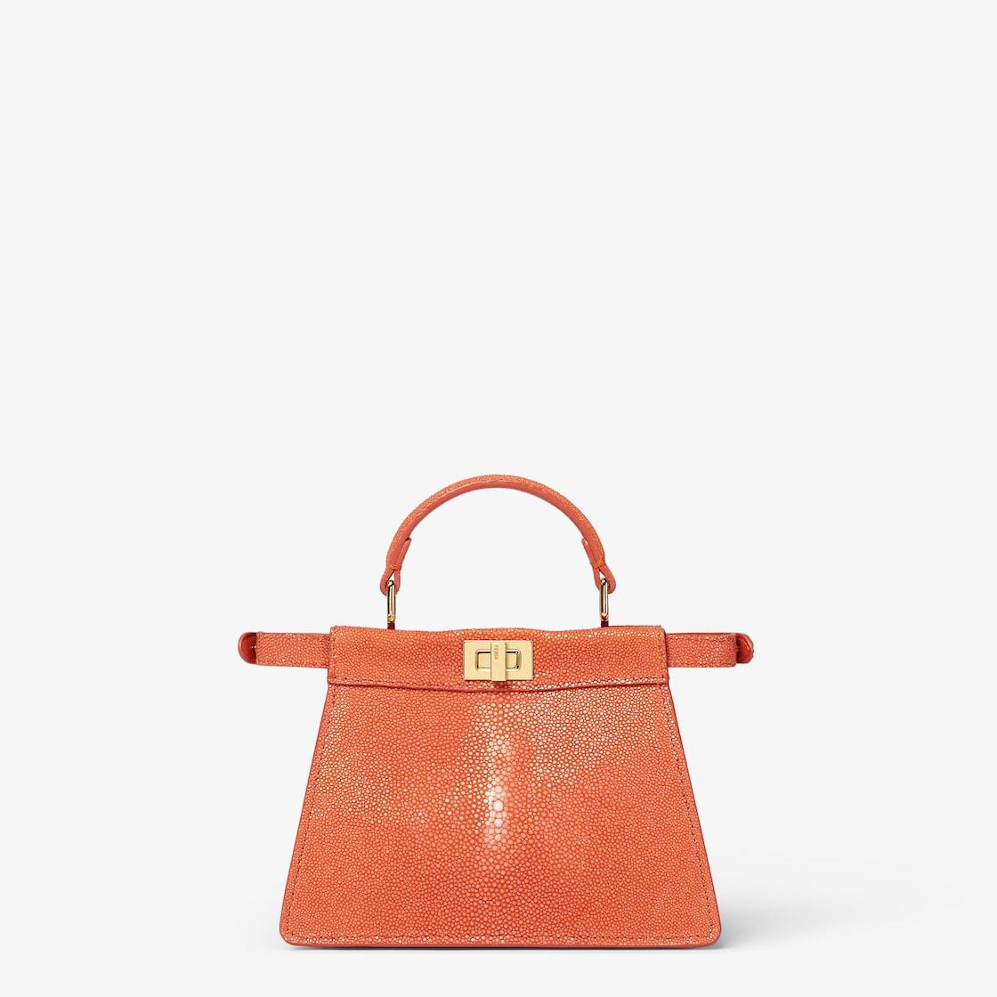 Iconic small Peekaboo ISeeU bag, the epitome of Fendi craftsmanship and creativity. A timeless icon, the Peekaboo was created in 2009. Like the children’s game it takes its name from, peek-a-boo, the bag plays with the beauty showcased on the outside and that concealed on the inside. Made of luxurious hand-polished orange stingray leather. Featuring interiors lined in soft tone-on-tone nappa leather, two internal compartments separated by a stiff partition and an inner pocket. Gold-finish bar, closure and metalware. Decorated with the iconic twist lock on both sides. The bag can be carried by hand or worn either on the shoulder or crossbody thanks to the handle and adjustable, detachable shoulder strap. Made in Italy