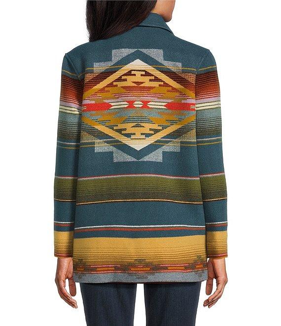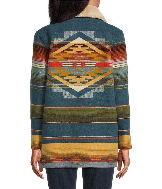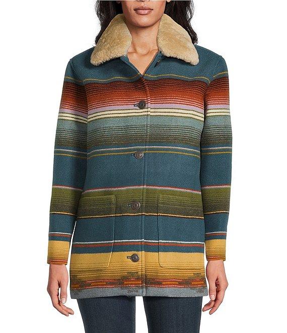 From Pendleton, this coat feature: Wool fabrication Detachable shearling point collar Long sleeves Stripe Fully lined Two front patch functional pockets Fully lined Straight hemline Button front closure Approx. 29.5" length Virgin wool/cotton Approx. 29.5" length Dry clean only Imported.