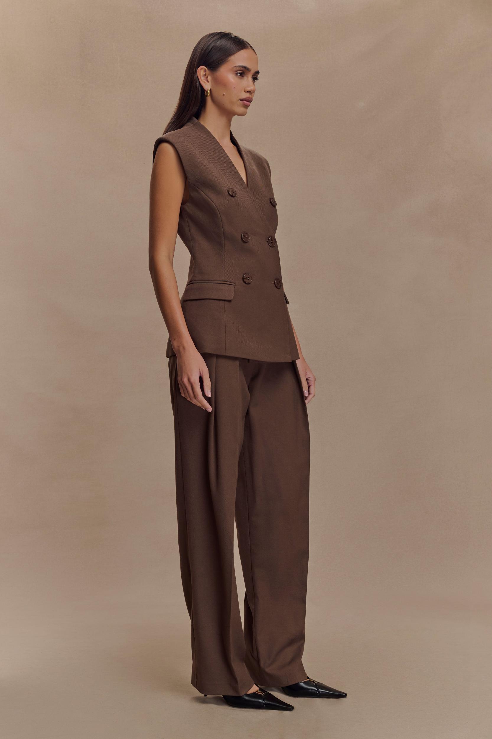 The vest that does it all. The PENELOPE Suiting Sleeveless Blazer is a bold take on classic tailoring. Designed with an asymmetric V-neckline and functional double-breasted button closure, this longline vest features structured shoulder pads for a confident silhouette. The sleeveless design adds a fresh, contemporary feel, while full lining ensures a smooth finish. Whether worn solo or layered, this blazer delivers power dressing with a modern twist. Pair with the Penelope Pleated High Waisted Pants for a coordinated look.