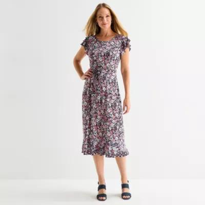 Perceptions Womens Short Sleeve Floral Midi Fit + Flare Dress