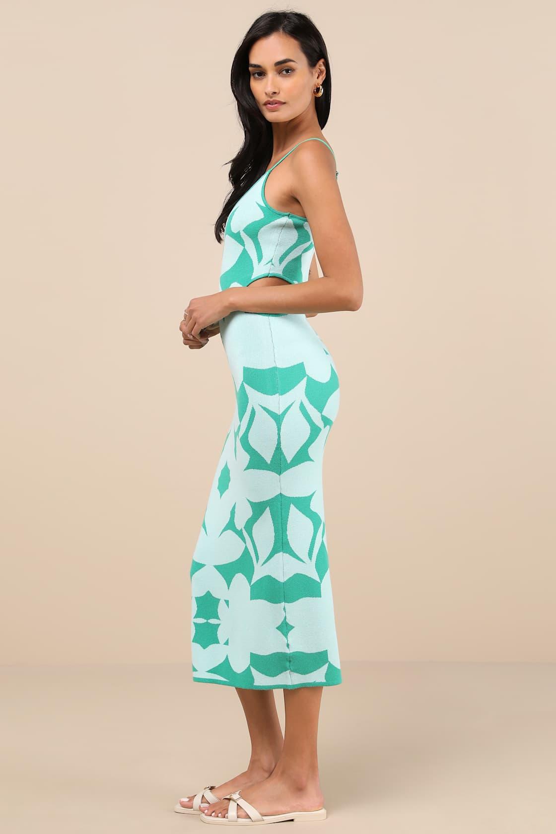 Tell all the stylish babes that the cutest summer look just dropped— the Lulus Perfectly Charming Teal Green Abstract Cutout Midi Sweater Dress! An abstract, floral-inspired design (in varying hues of teal green) adorns stretchy sweater knit as it shapes this trendy lil' dress that features adjustable spaghetti straps, a flirty V-neckline, and a sleeveless bodice with a keyhole cutout at the center. The flattering bodycon silhouette boasts twin side cutouts at the fitted waist and falls to a chic midi hem.