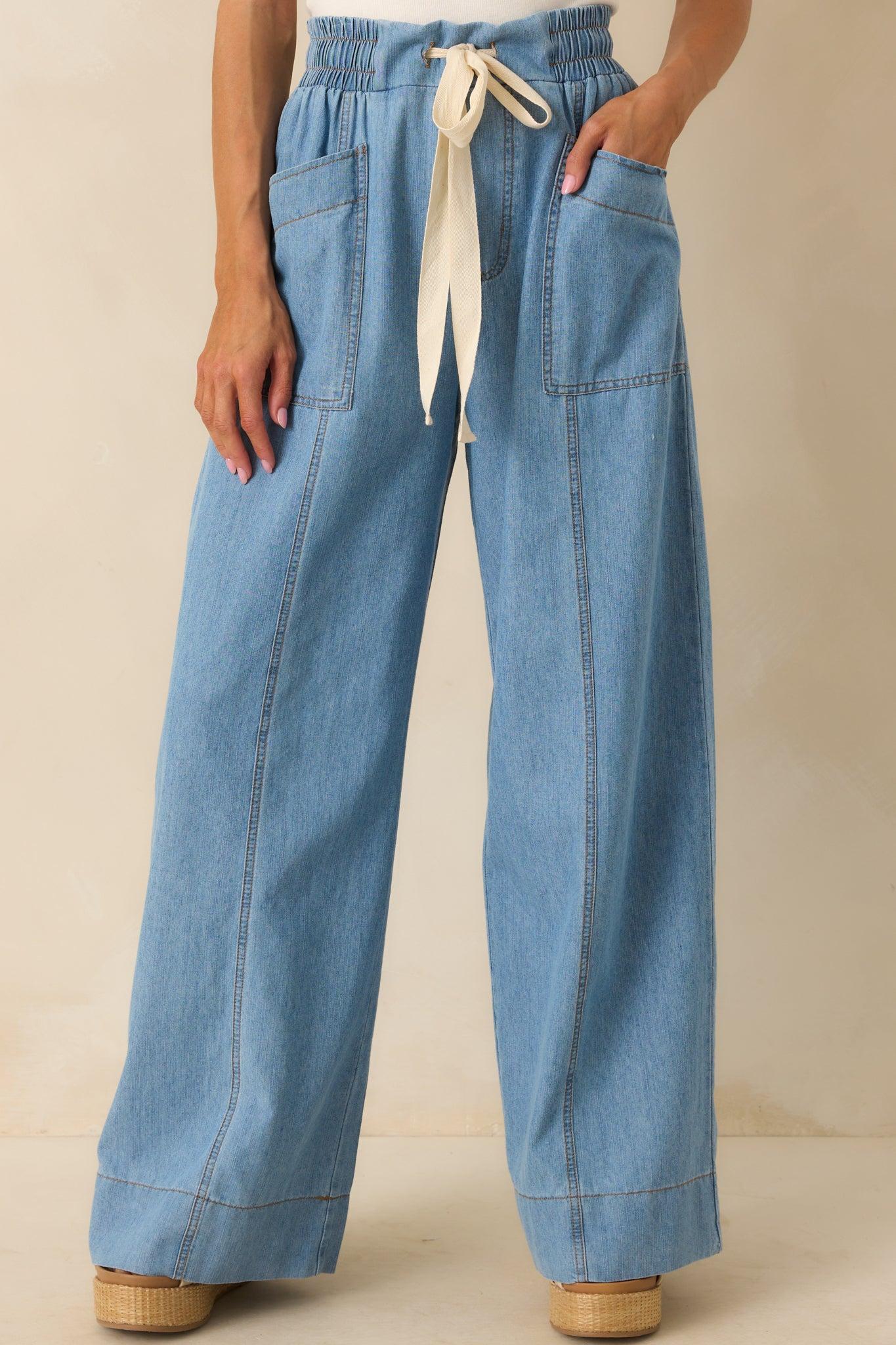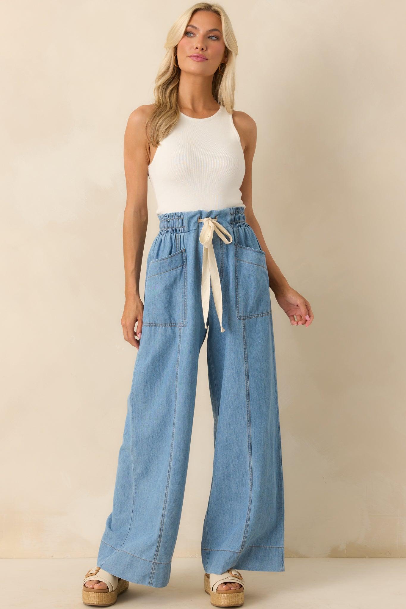 The Perfectly Unplanned Light Wash Cotton Chambray Wide Leg Pants are made for those effortlessly good days. Easy, relaxed, and full of movement, they bring a laid-back confidence to your look—no plan required. These light wash pants feature a lightweight cotton chambray fabric, a wide elastic high rise waistband, functional ivory drawstring waist, paneled design, functional front and back patch pockets, and tan topstitching throughout.