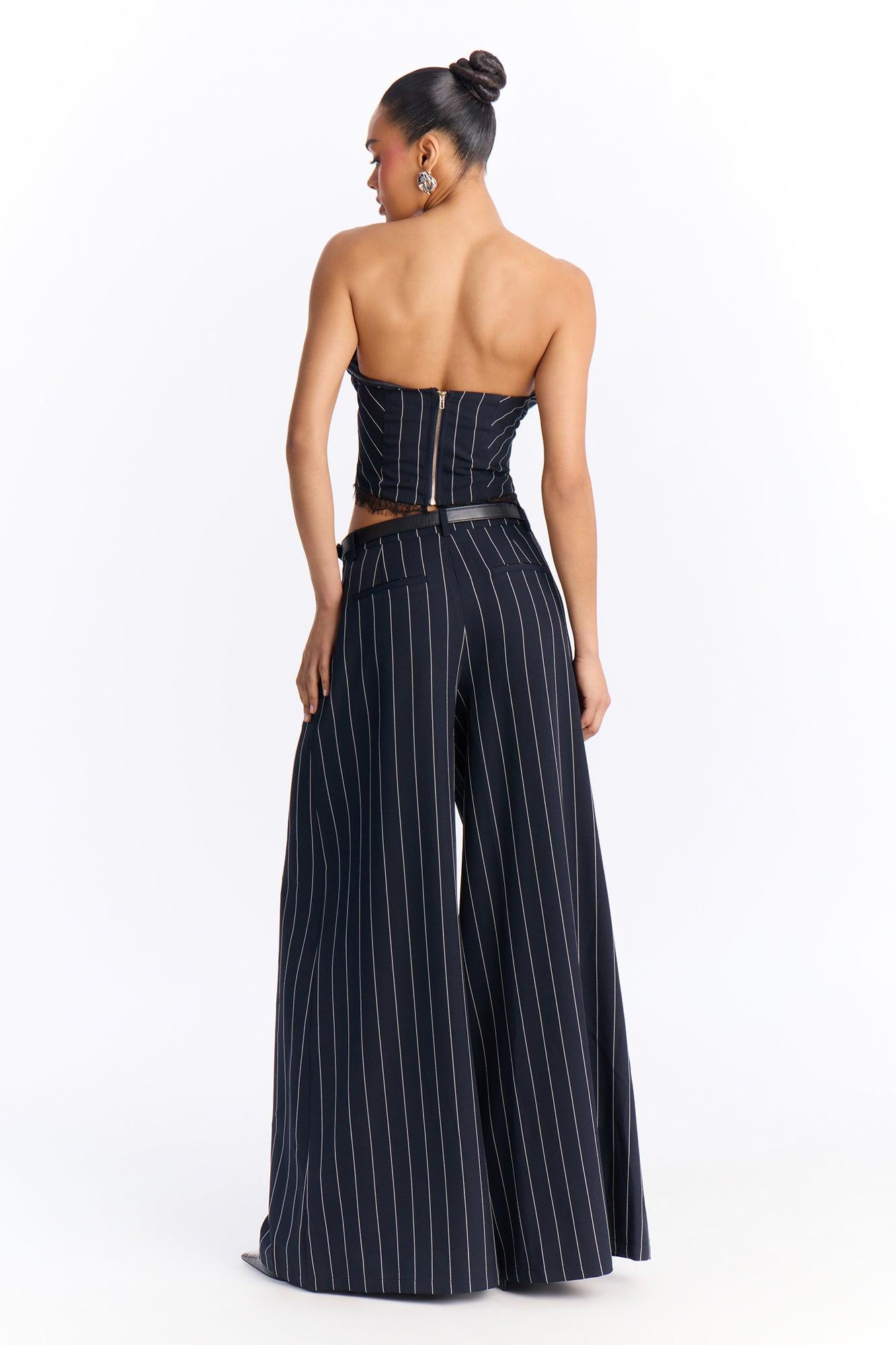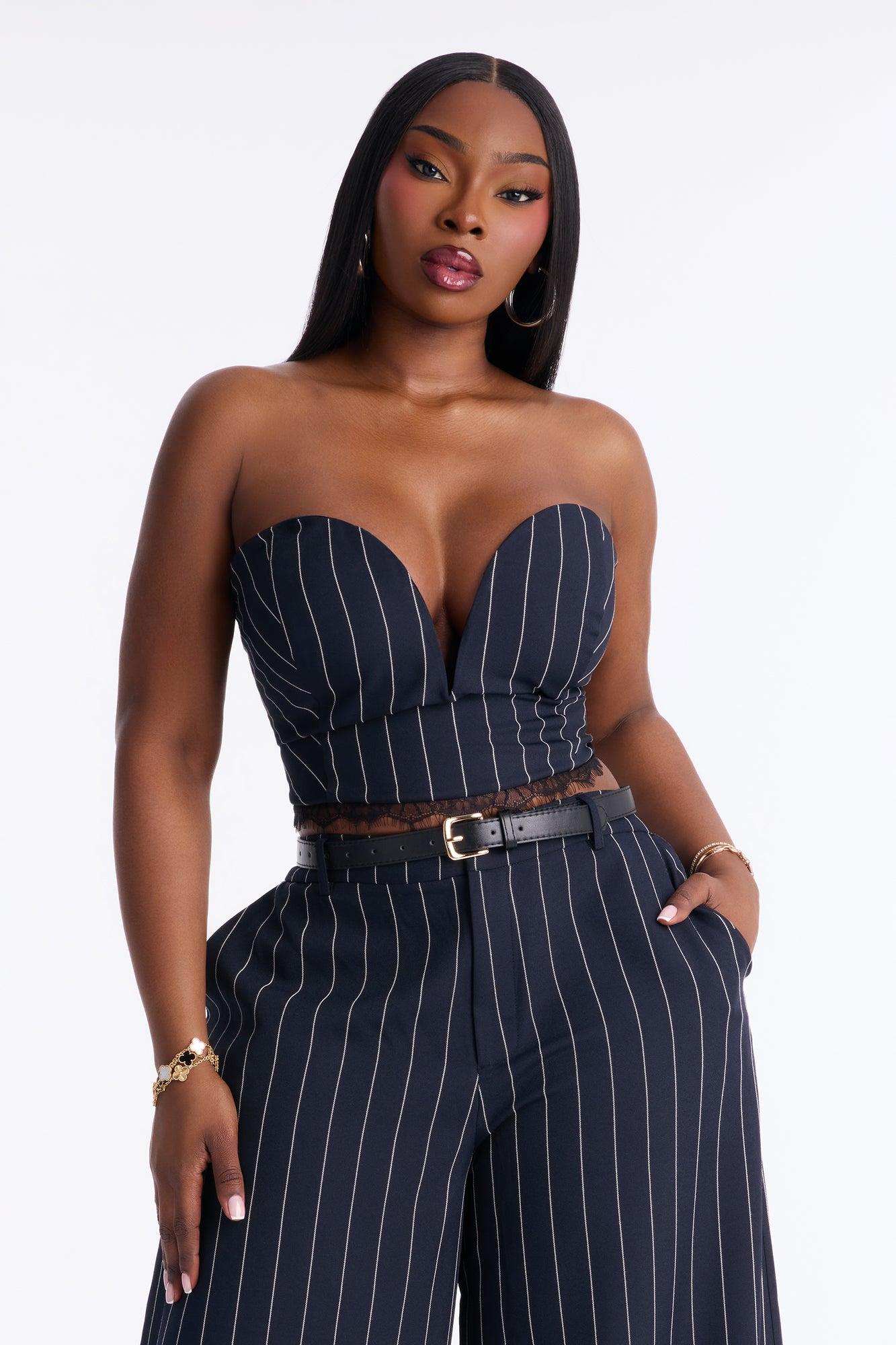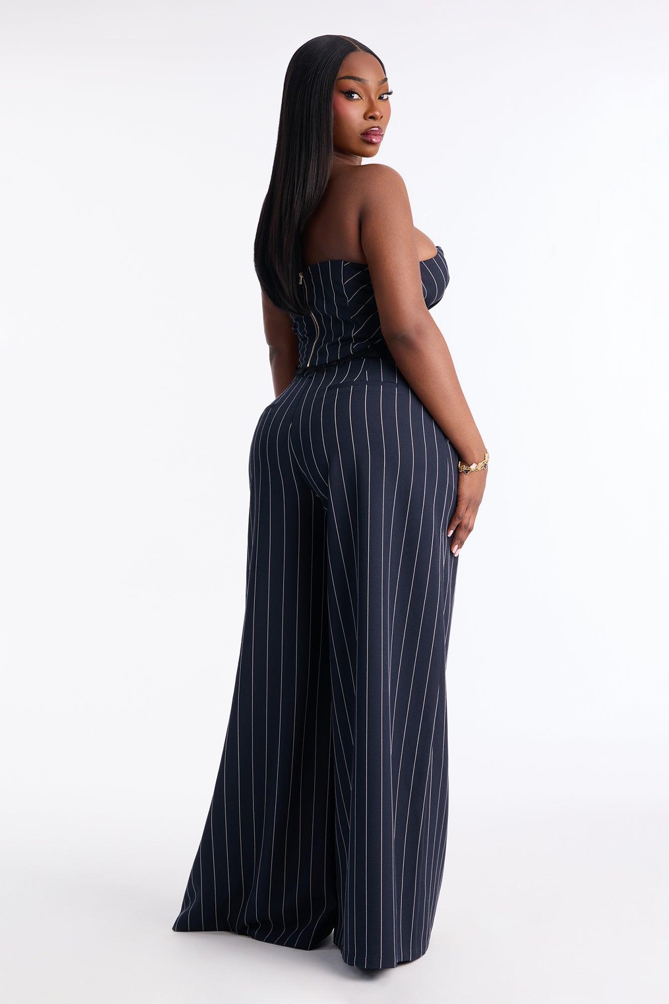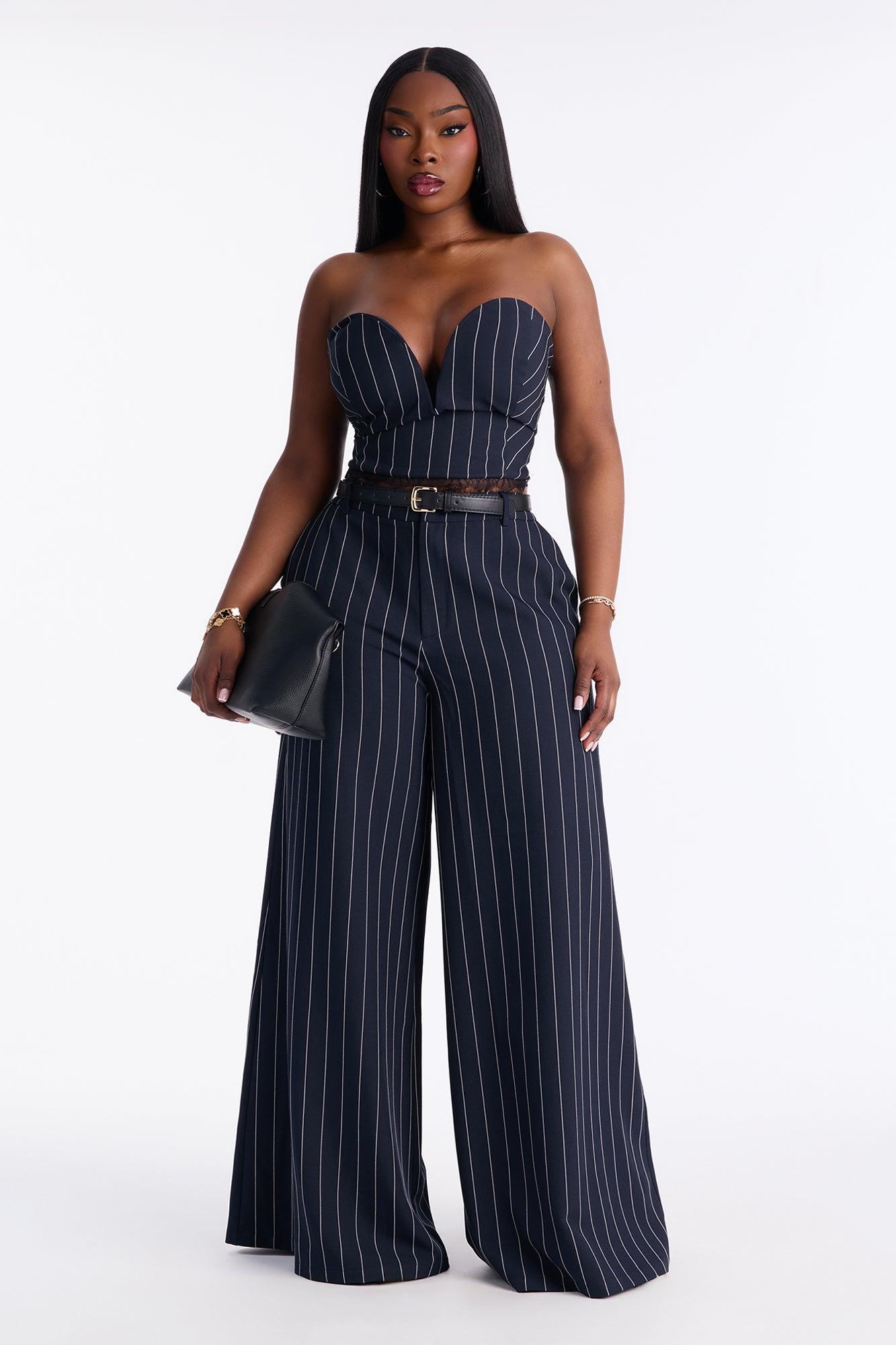 Available In Navy. 2 Piece Ensemble Strapless Top And Wide Leg Pant Set Stretch Inseam 33" Lined Top With Back Zipper V-Wire Belted Front Closure With Fly Zipper On Pant Pockets Top & Bottom: Self: 95% Polyester 5% Spandex Top: Lining: 100% Polyester Imported