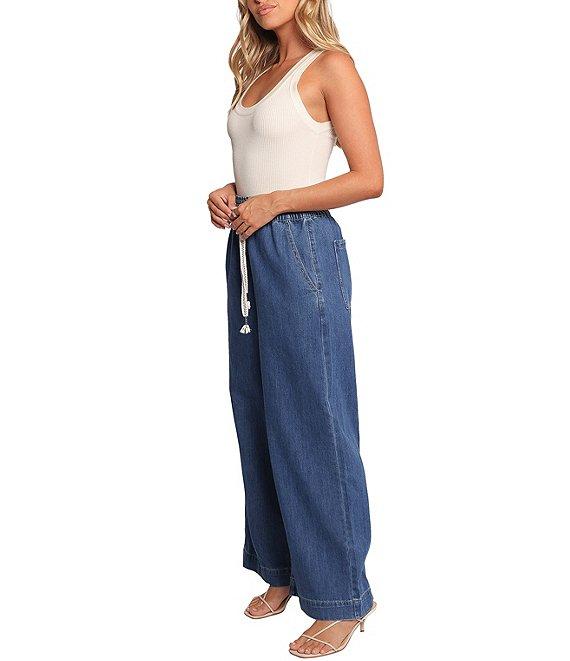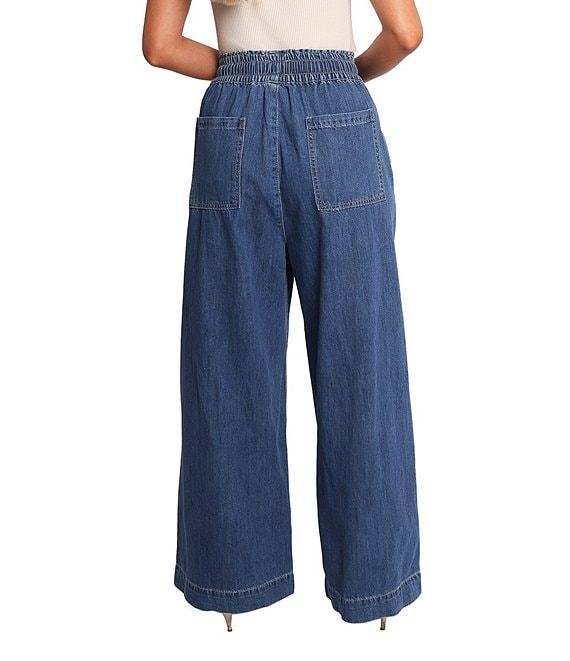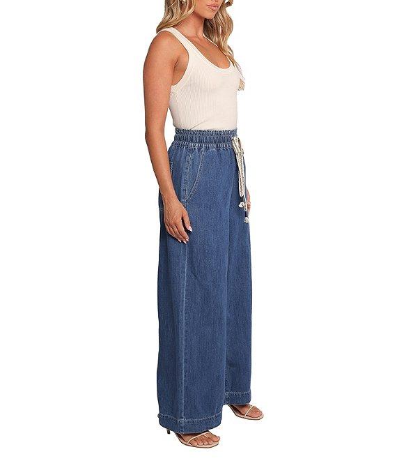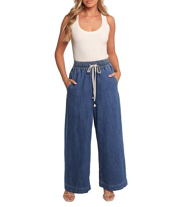From Petal & Pup, these pants feature: Denim fabrication Flat front silhouette High waisted Elastic drawstring waistband Pull-on construction Wide legs Side seam pockets Two back pockets Approx. 25" inseam, 14.96" rise, 12.99" leg opening Cotton Machine wash Imported.