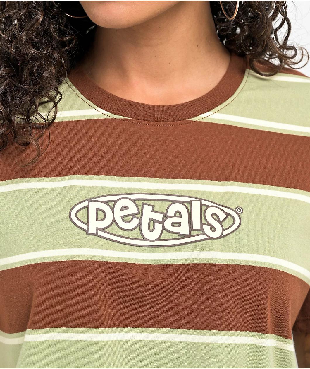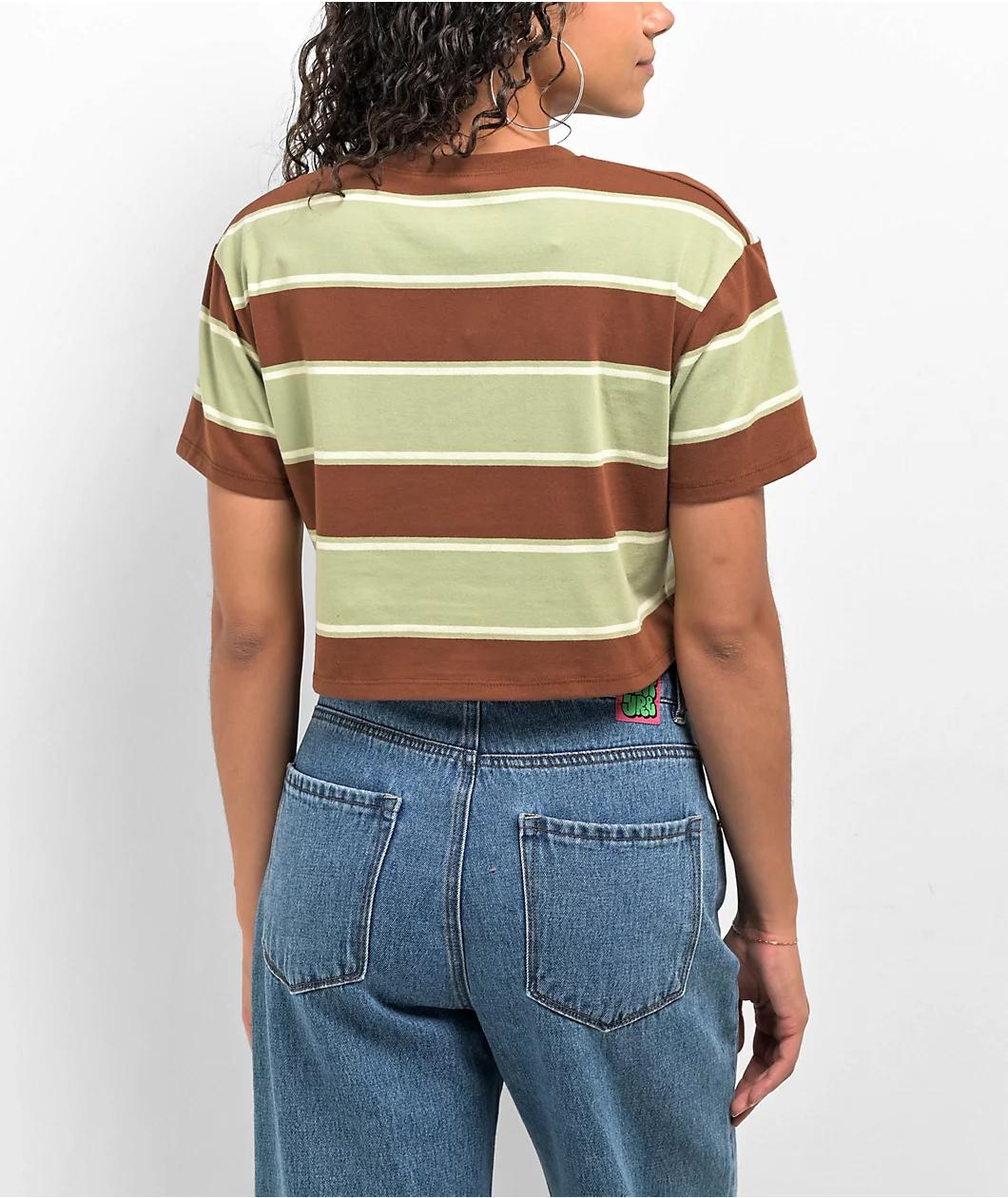 The Stripe crop t-shirt from Petals and Peacocks arrives in a green and brown colorway offering earth tones for a breezy casual look. Featuring silicone-printed branding on the front in a Y2K style logo, this shirt has a unique silhouette cropped cut as i