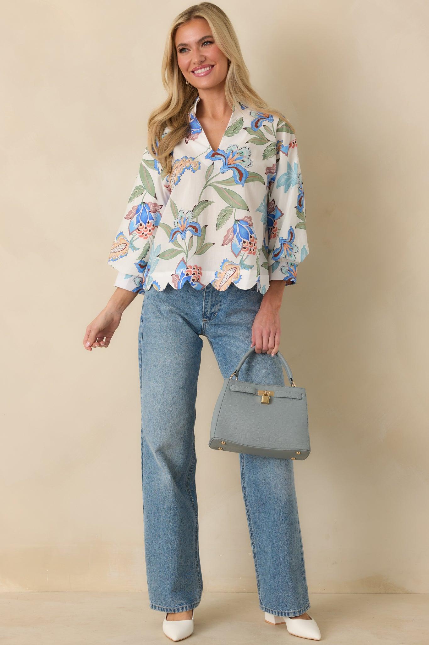Soft, airy, and full of spring charm, the Petals in the Breeze Blue Multi Cotton Floral V-Neck Top brings an easy elegance to your everyday lineup. The delicate floral print and scalloped hem feel feminine without trying too hard, making it a natural choice for sunny days, casual plans, and everything in between. This blue multicolor top is crafted from lightweight cotton fabric and features a flattering V-neckline with 3/4 length sleeves. Design details include buttoned sleeve cuffs, a relaxed silhouette, and a scalloped hemline for a soft, polished finish. The breathable construction makes it comfortable for all-day wear. 100% Cotton Contrast: 80% Polyester & 20% Cotton Lining: 100% Polyester Hand Wash Cold Manufactured in China Designed in The USA Model is 5'6" and Wearing a Size Small, Clipped, Model is a True X-Small